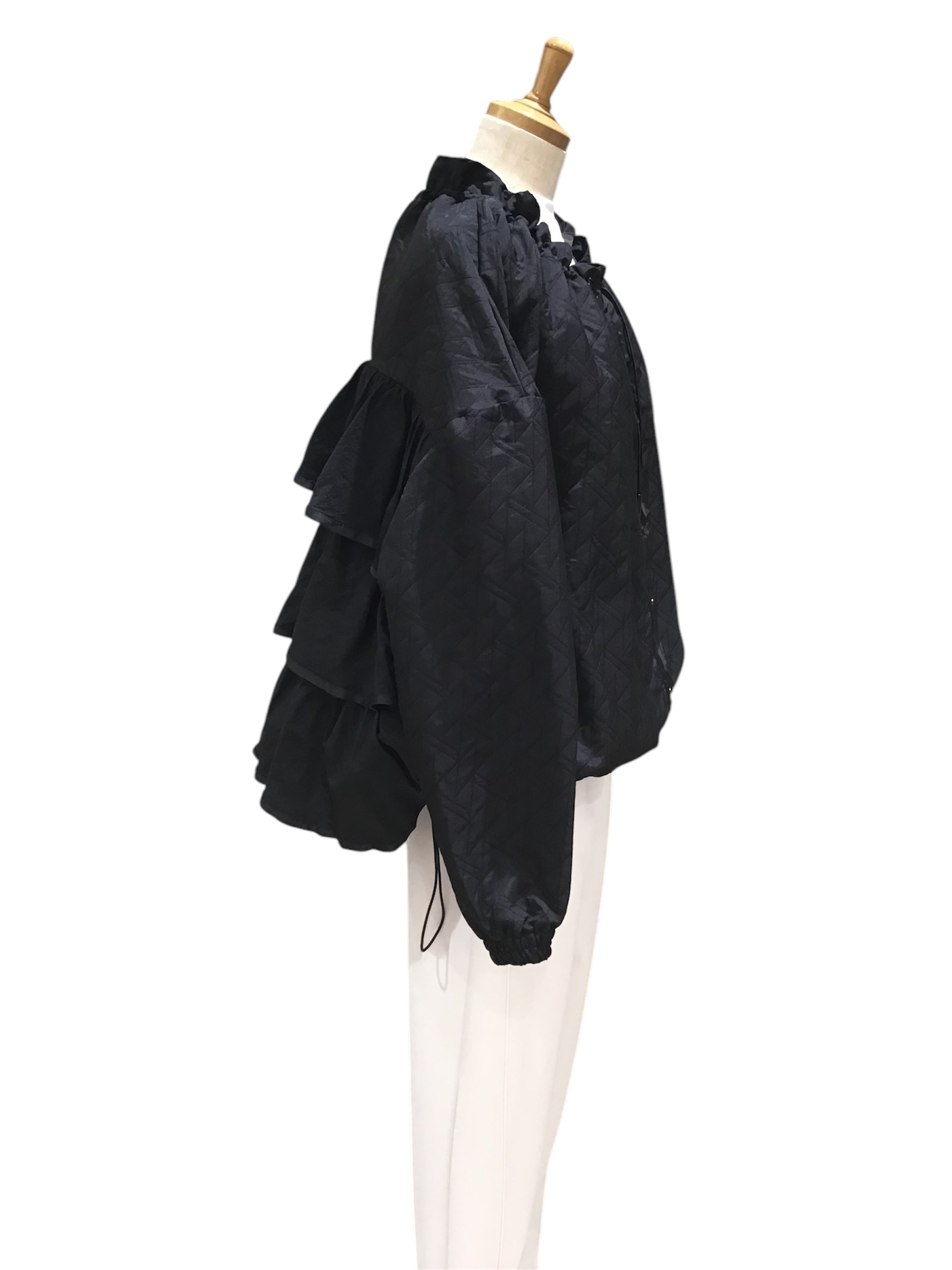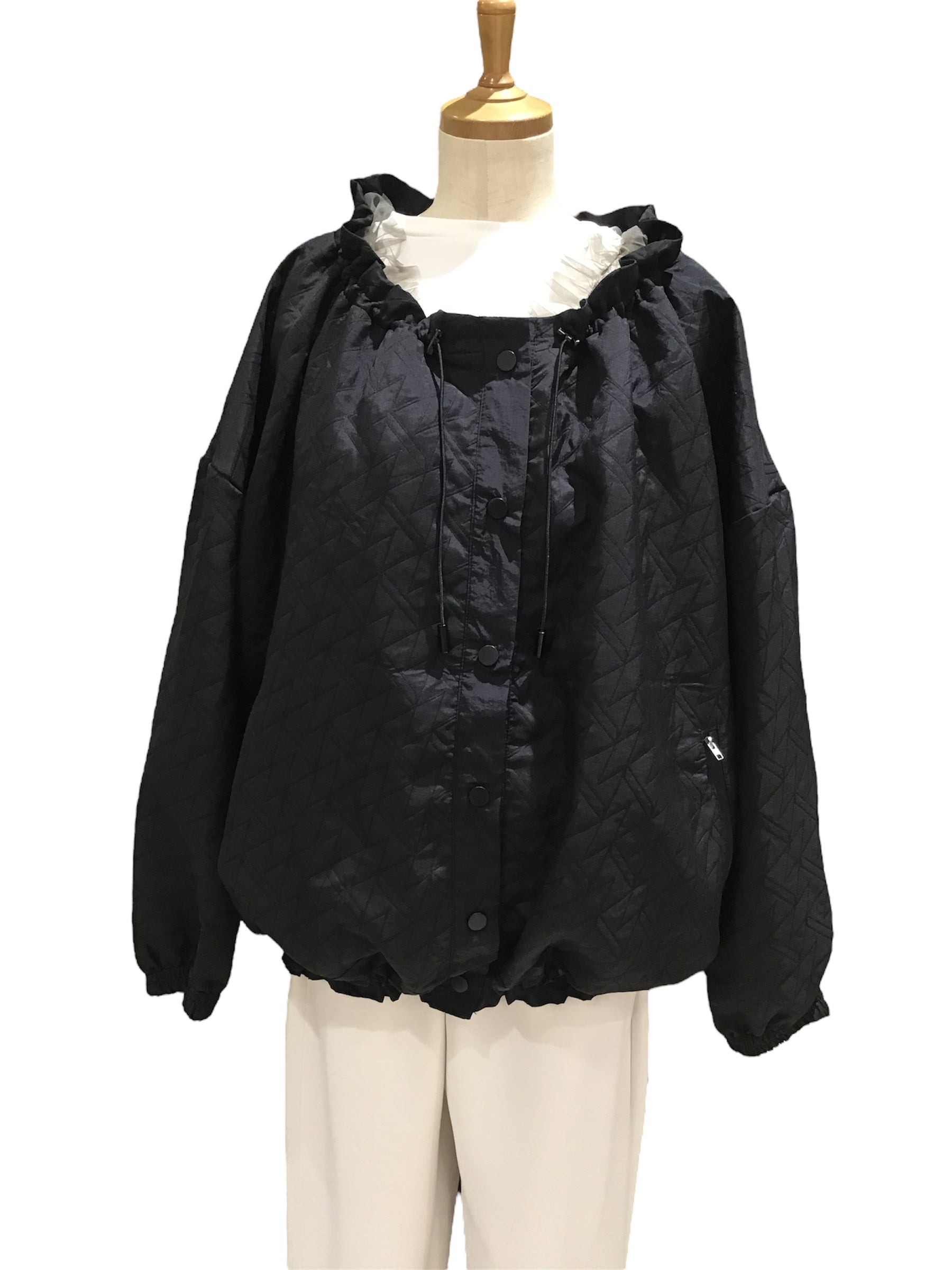 バックにフリルがついたジャケットです。裾、首元はドロストになっており、絞って首元の空き具合、ウエスト部分の長さ調整が可能です。裏地が無しで春先や秋口にサラッと羽織って頂けます。/サイズ 総丈:63cm、身幅60cm(平置きにて計測)/素材:ポリエステル100%