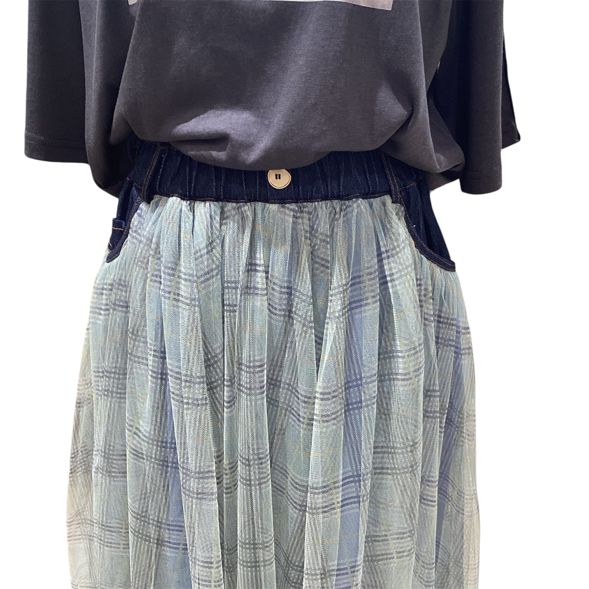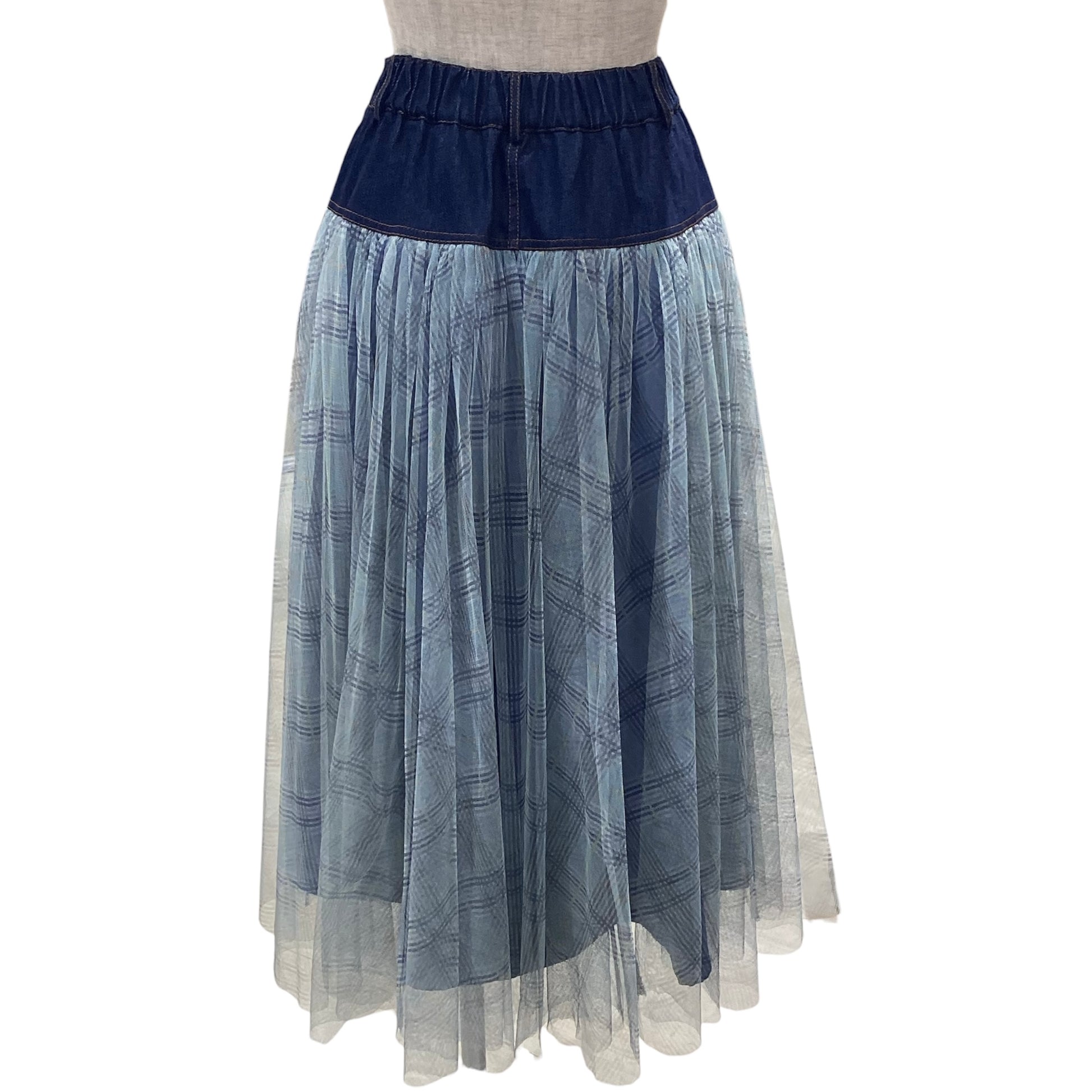 デニムの力強さとチュールの透明感が歩くたびにドラマチックな残像を残すロングスカートです!