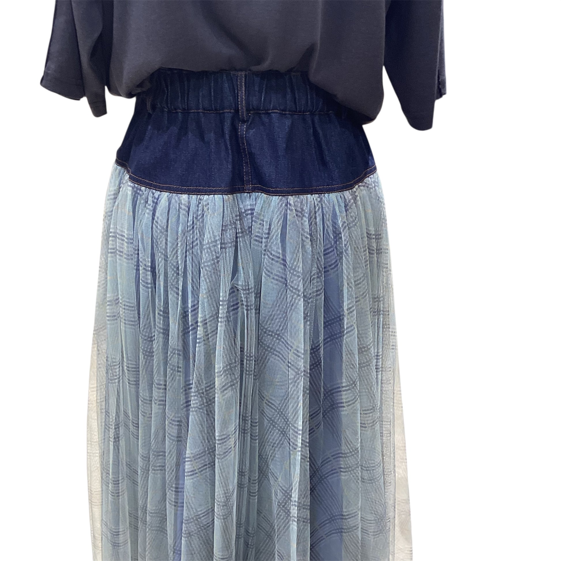 異素材を大胆にレイヤードし、視覚的な面白さを追求したデザインスカートです。裾に向かって不規則に広がるチュールが、足元に繊細なニュアンスを与え、身体の動きに合わせて複雑な表情の変化を見せます。ウエスト周りはデニム素材でスッキリと引き締め、腰位置を高く見せる工夫を施しました。ポケットあり。