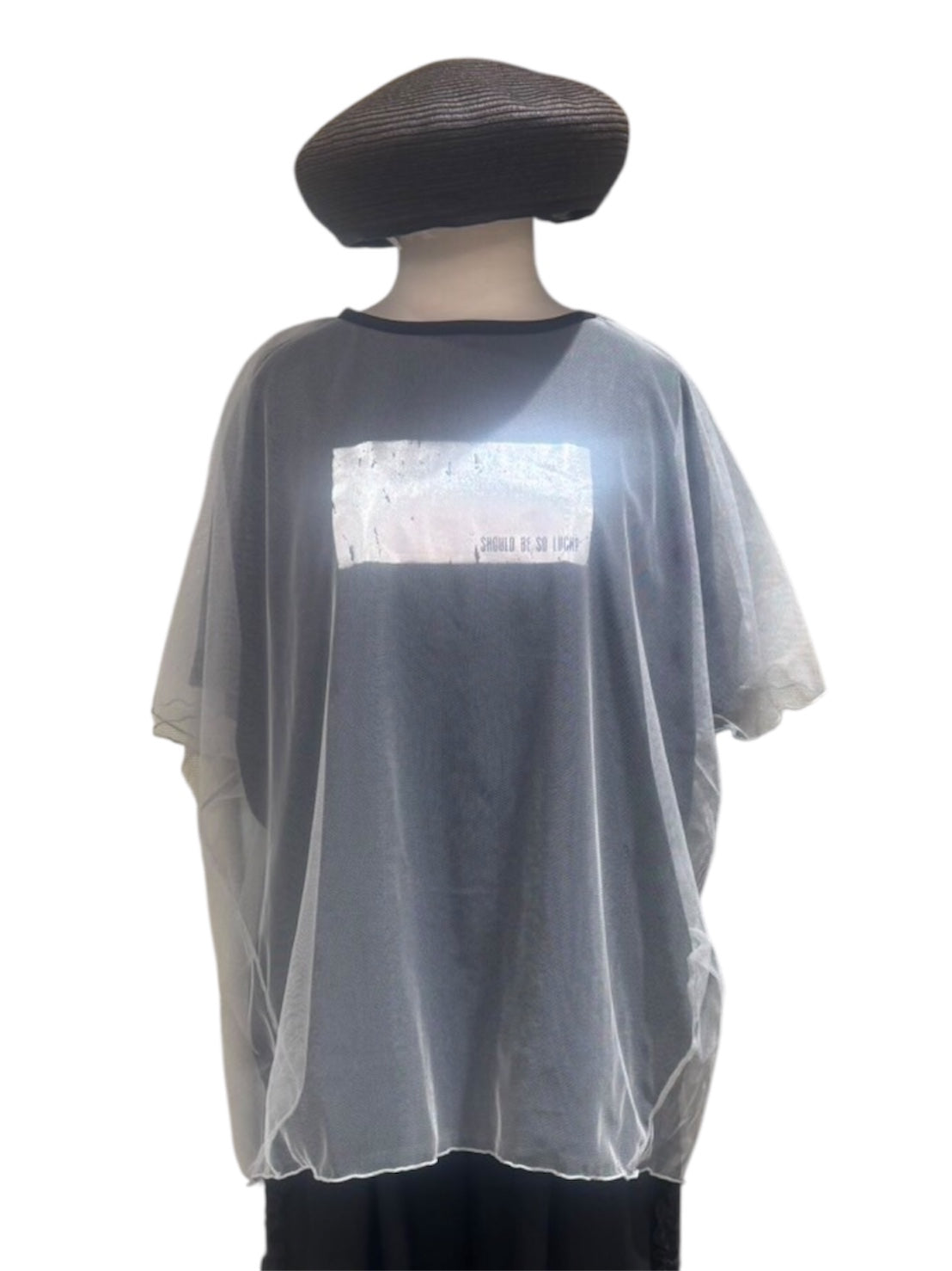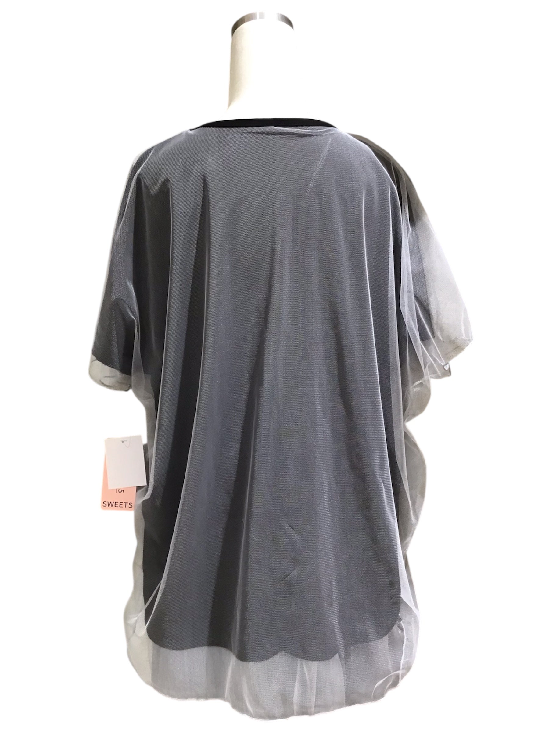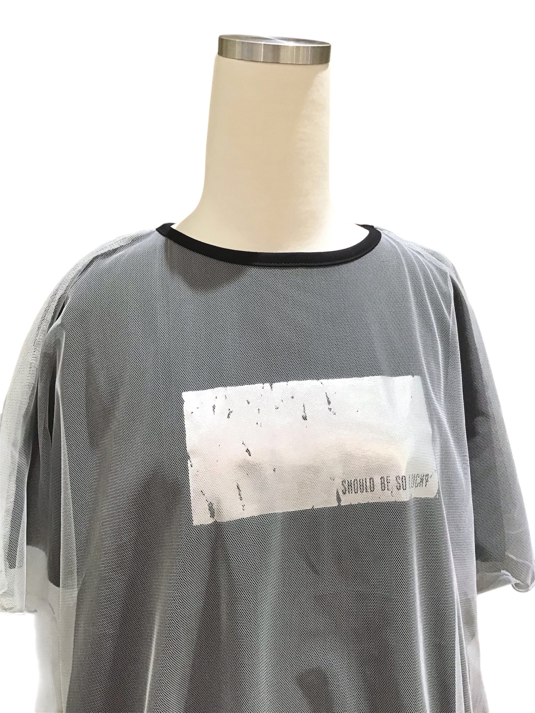 かすれ感のあるシルバーの箔プリントがポイントの、チュールドッキングTシャツです。デザインがとても凝っていて存在感のある一枚。
