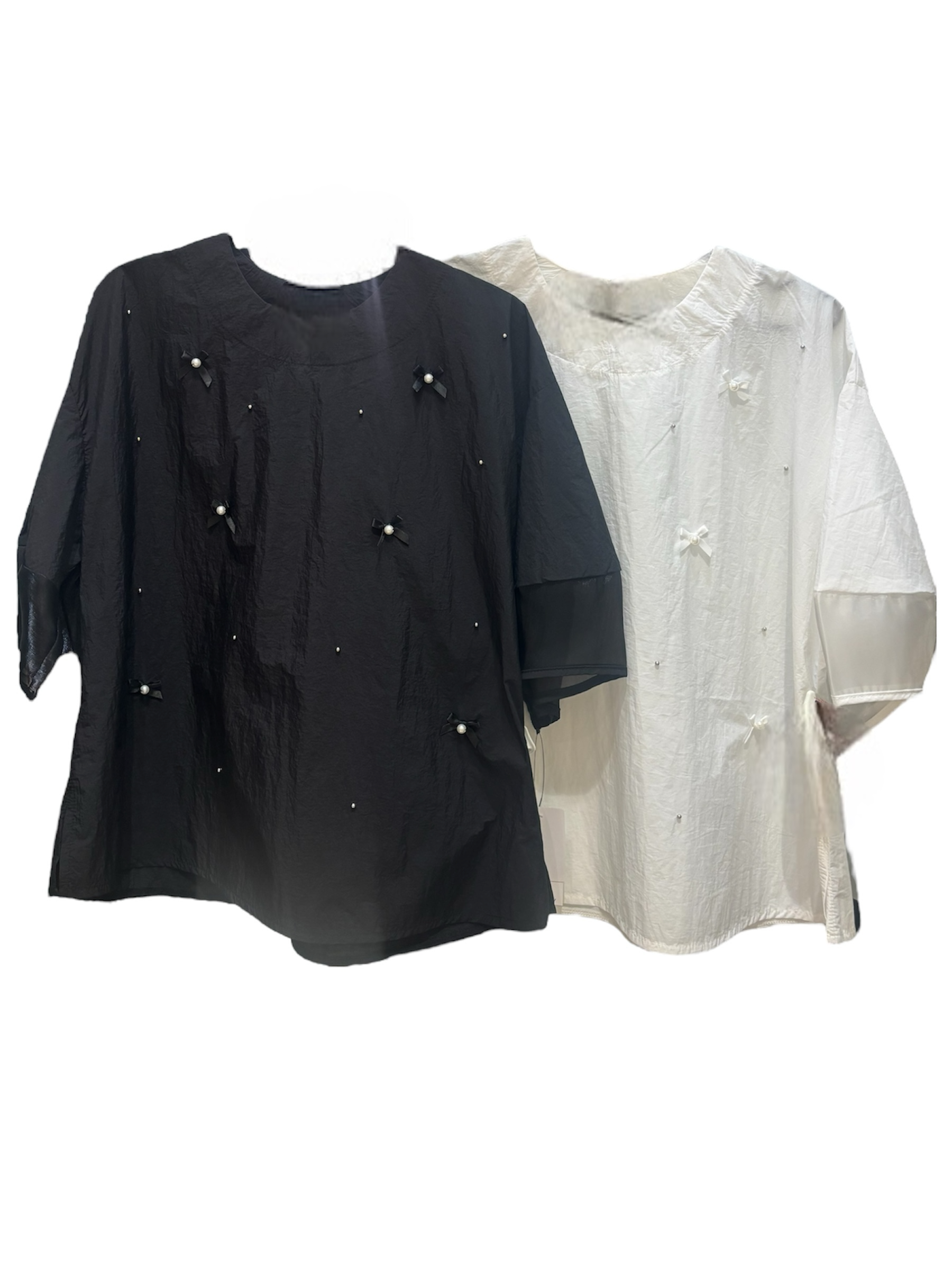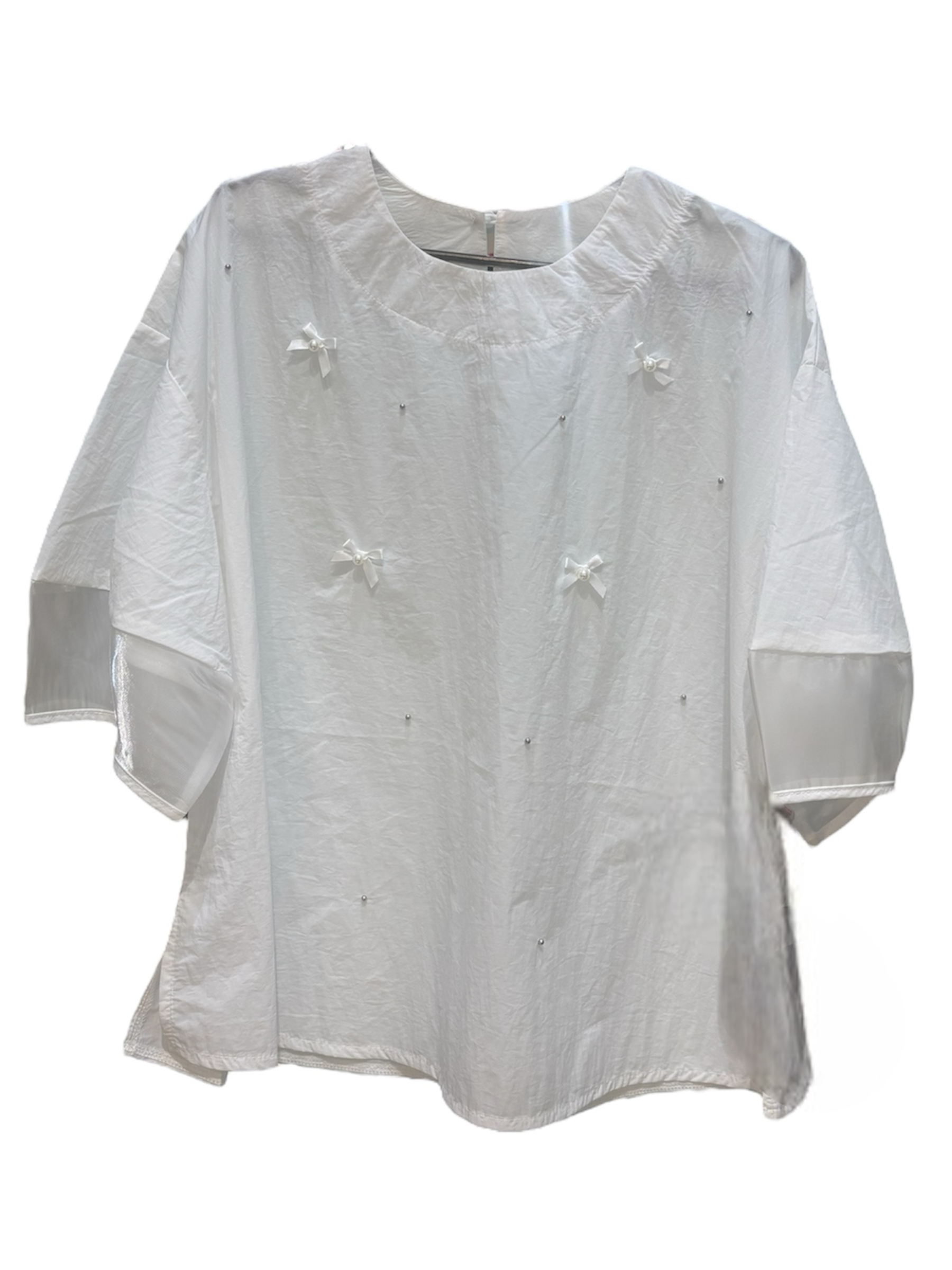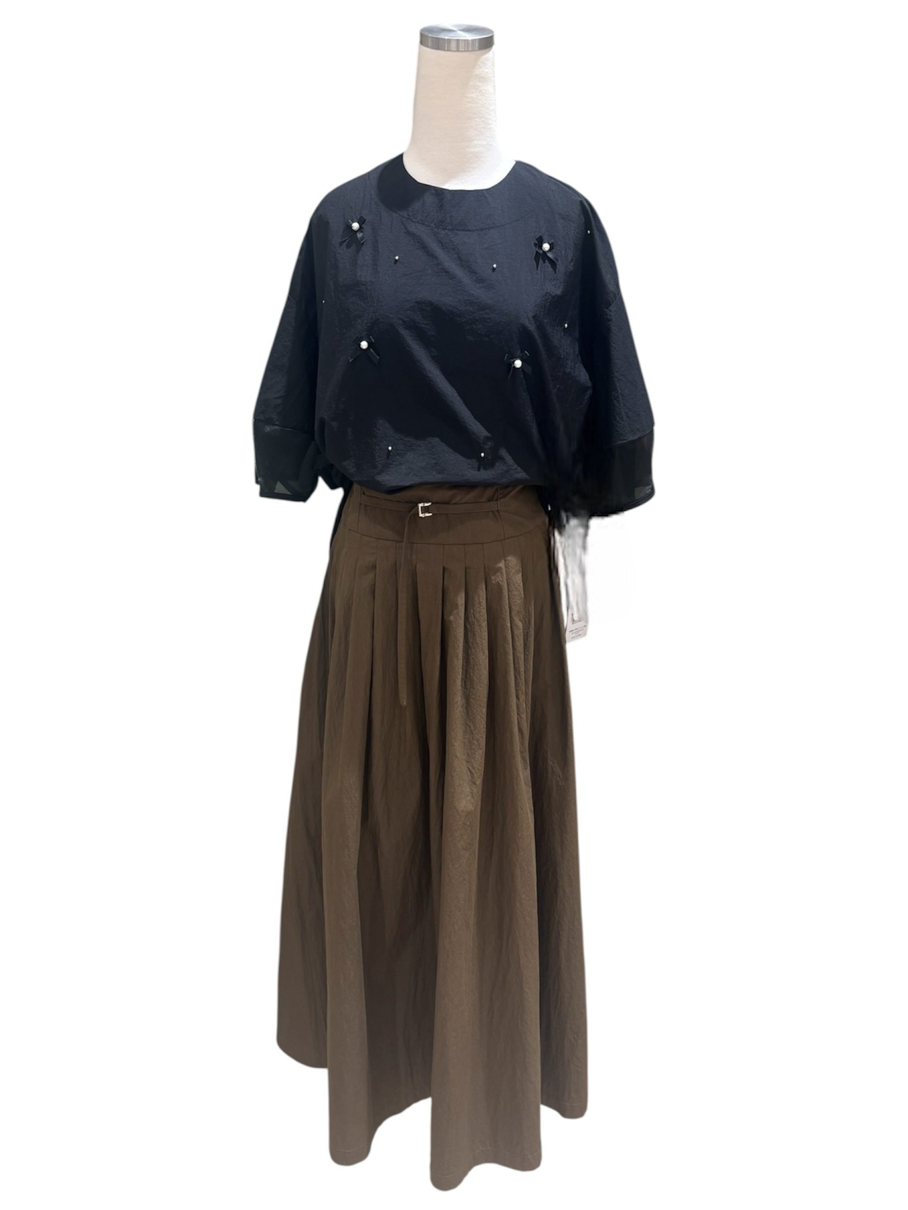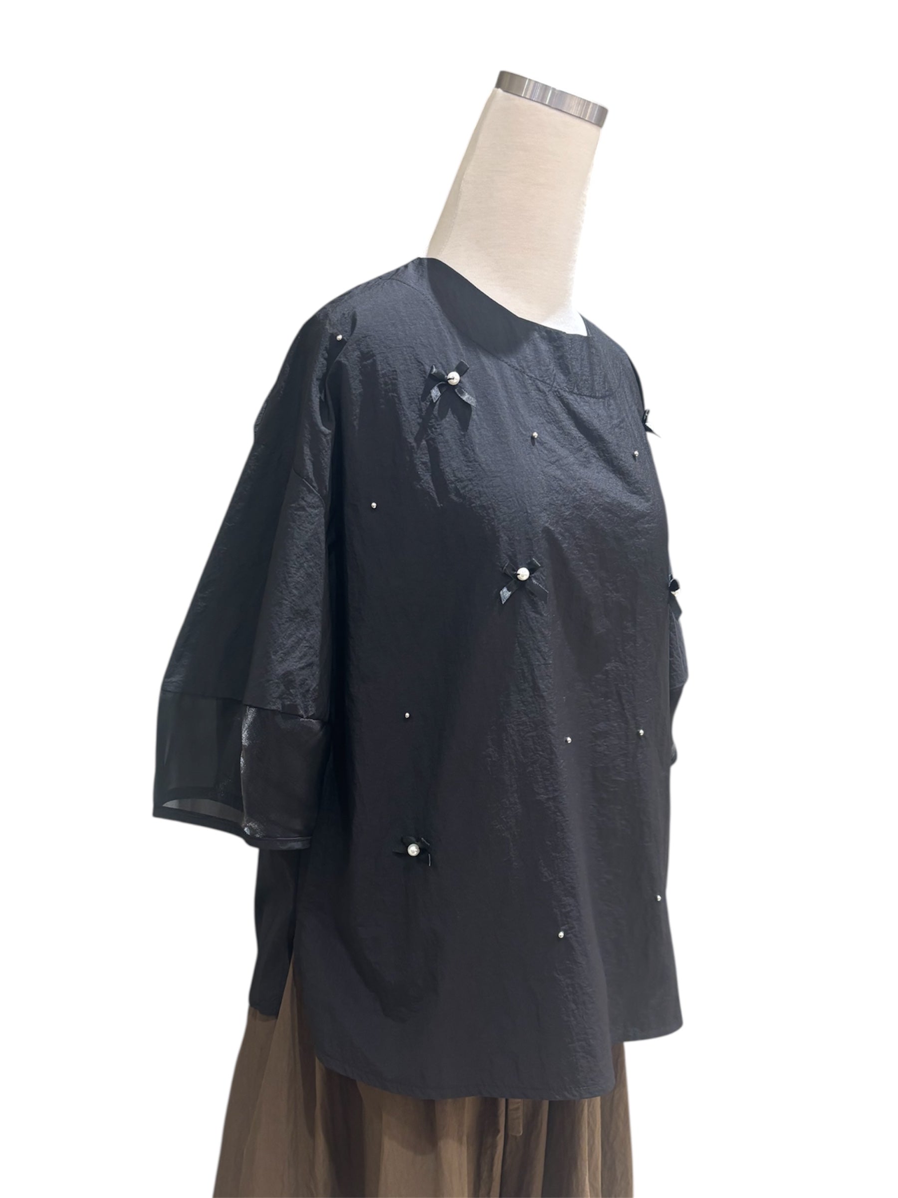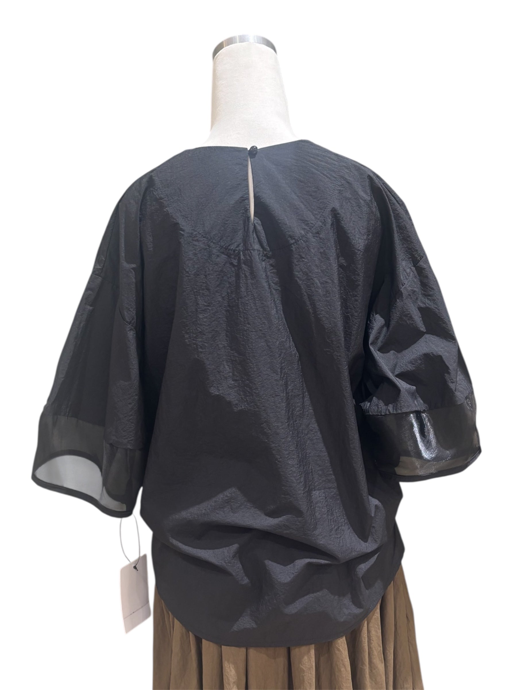 袖口、裾がオーガンジーで透け感があり、着心地の軽いブラウスです。