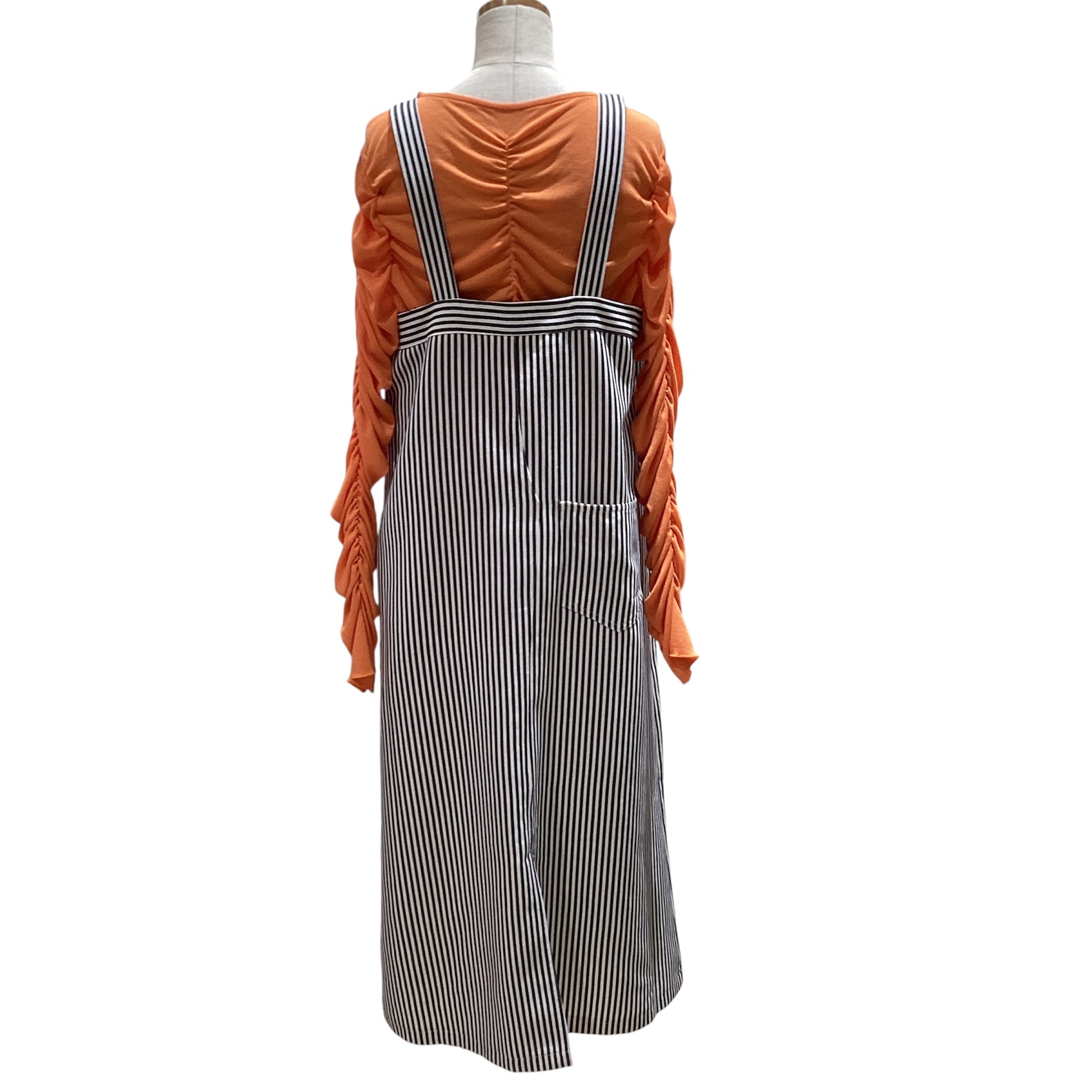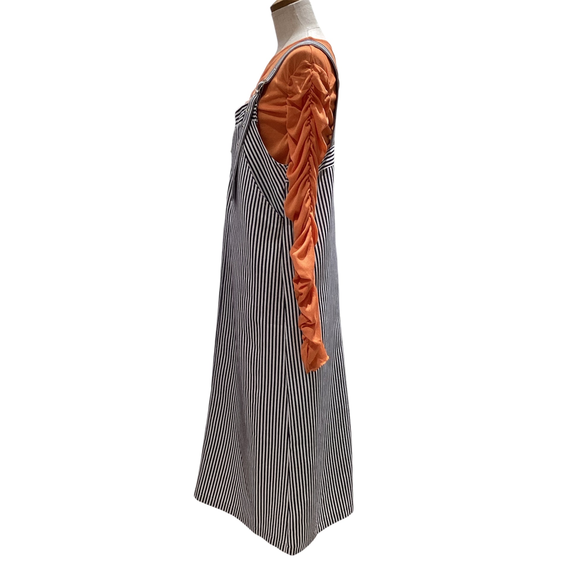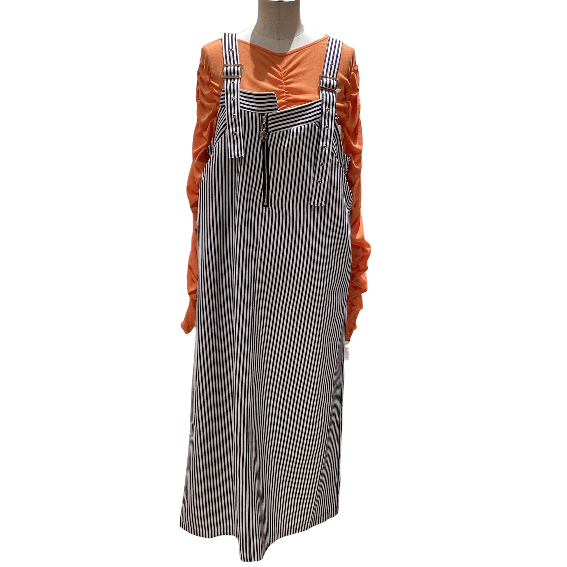 最大のポイントは、胸周りに取り入れた構築的なデザインと、左右で長さを変えたアシンメトリーな肩ベルト。無機質なアイレット(ハトメ)を並べたベルトが、ヒッコリーのカジュアルな印象をシャープに引き締め、モダンな個性を放ちます。ゆったりとしたオーバーサイズシルエットは、気になる体型を自然にカバー◎リラックスした着心地でありながら、計算されたカッティングによって、どこから見ても洗練された佇まいを叶えます。
