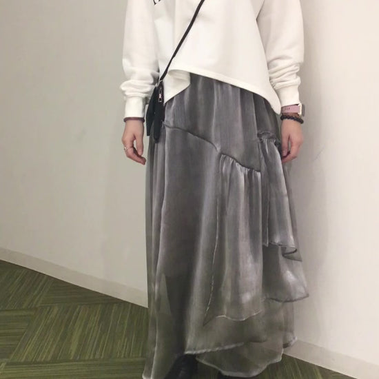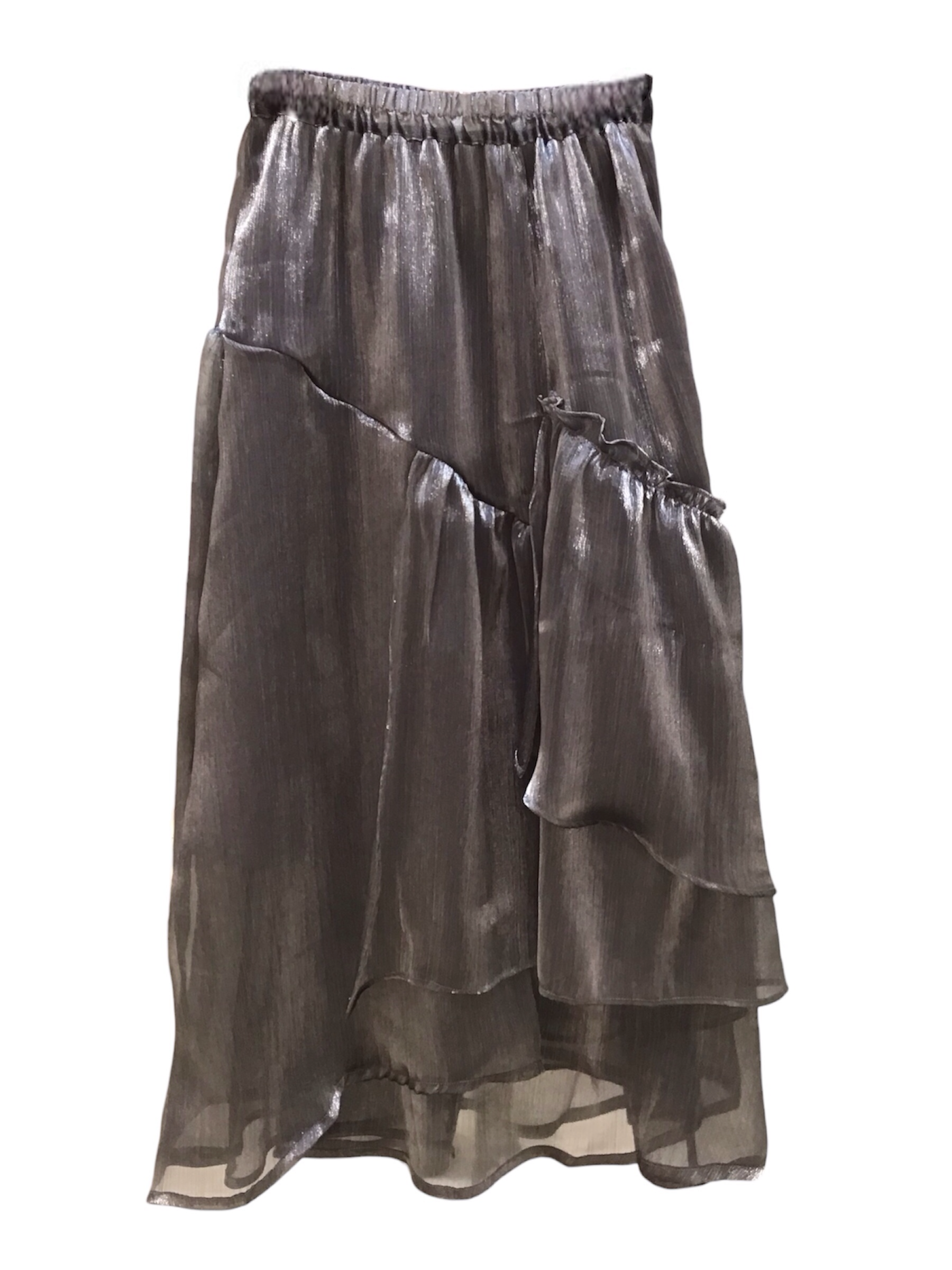 春夏シーズンにふさわしい軽やかなフリルスカートです。光沢感のある生地で上品に着ていただけます。/サイズ:ウエスト平置き33cm(総ゴム最小時)、総丈:約90cm/素材:ポリエステル100%