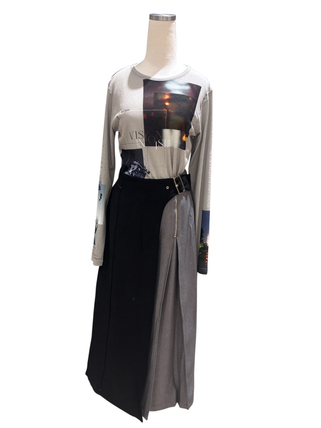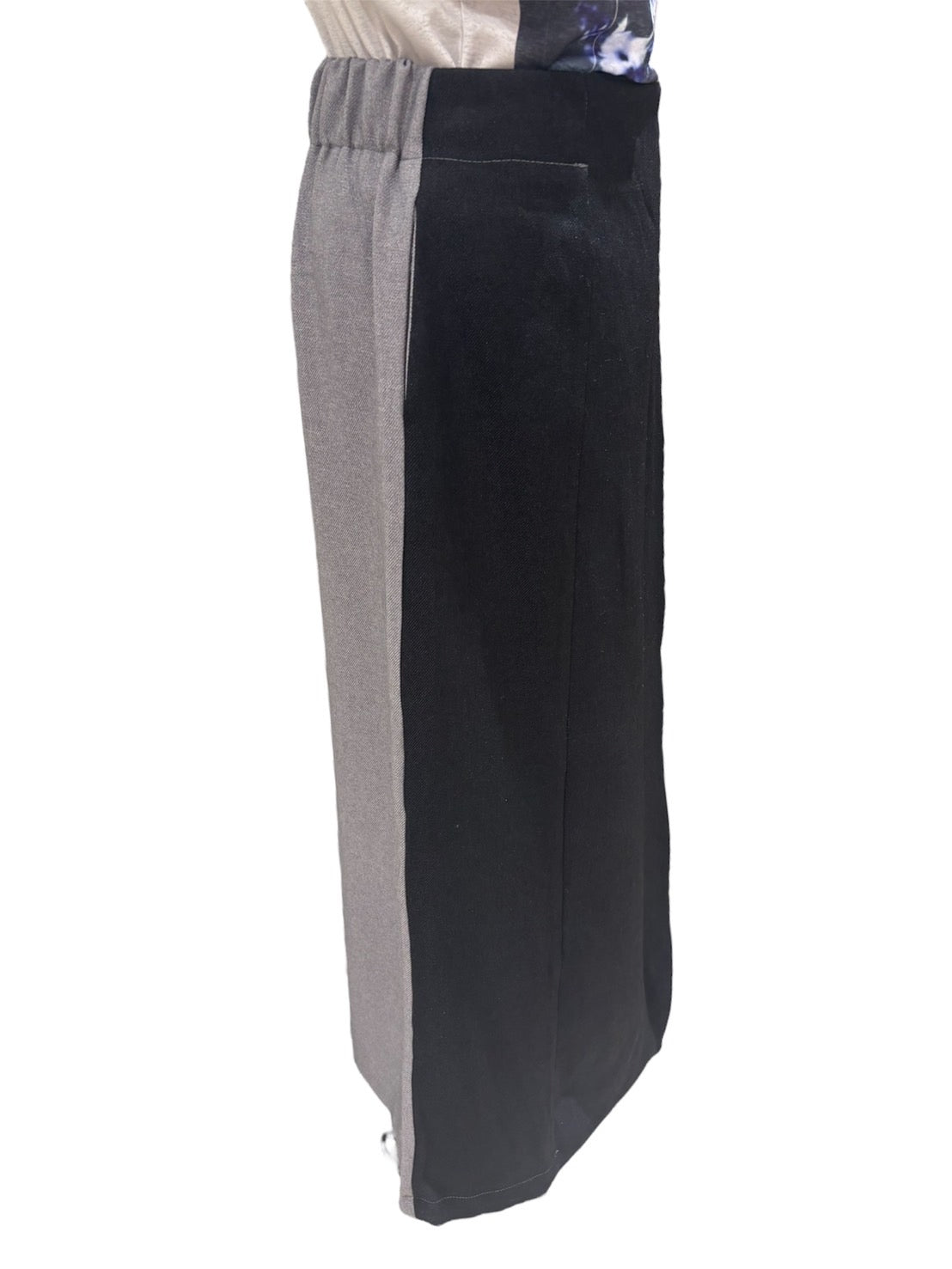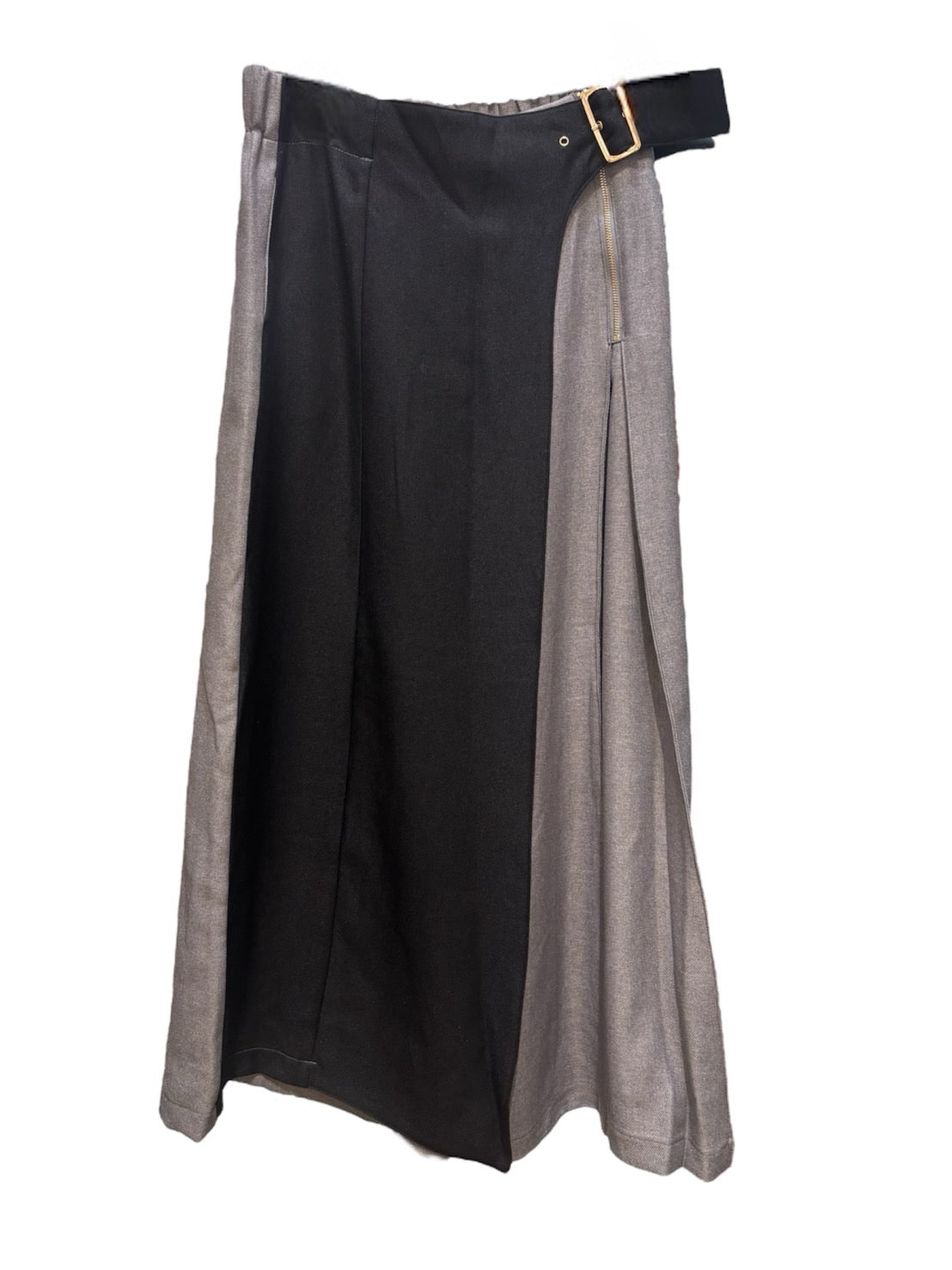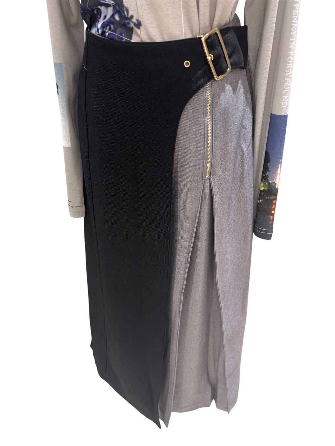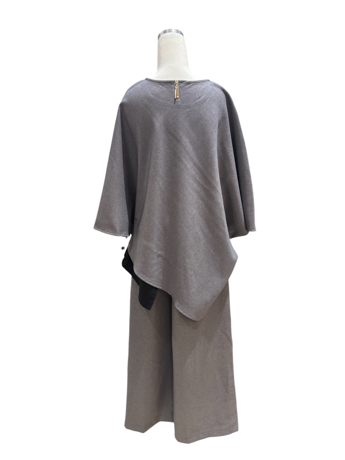 アシンメトリーなデザインとバイカラーがとても素敵な1着です。ポケットあり、後ろゴム仕様。