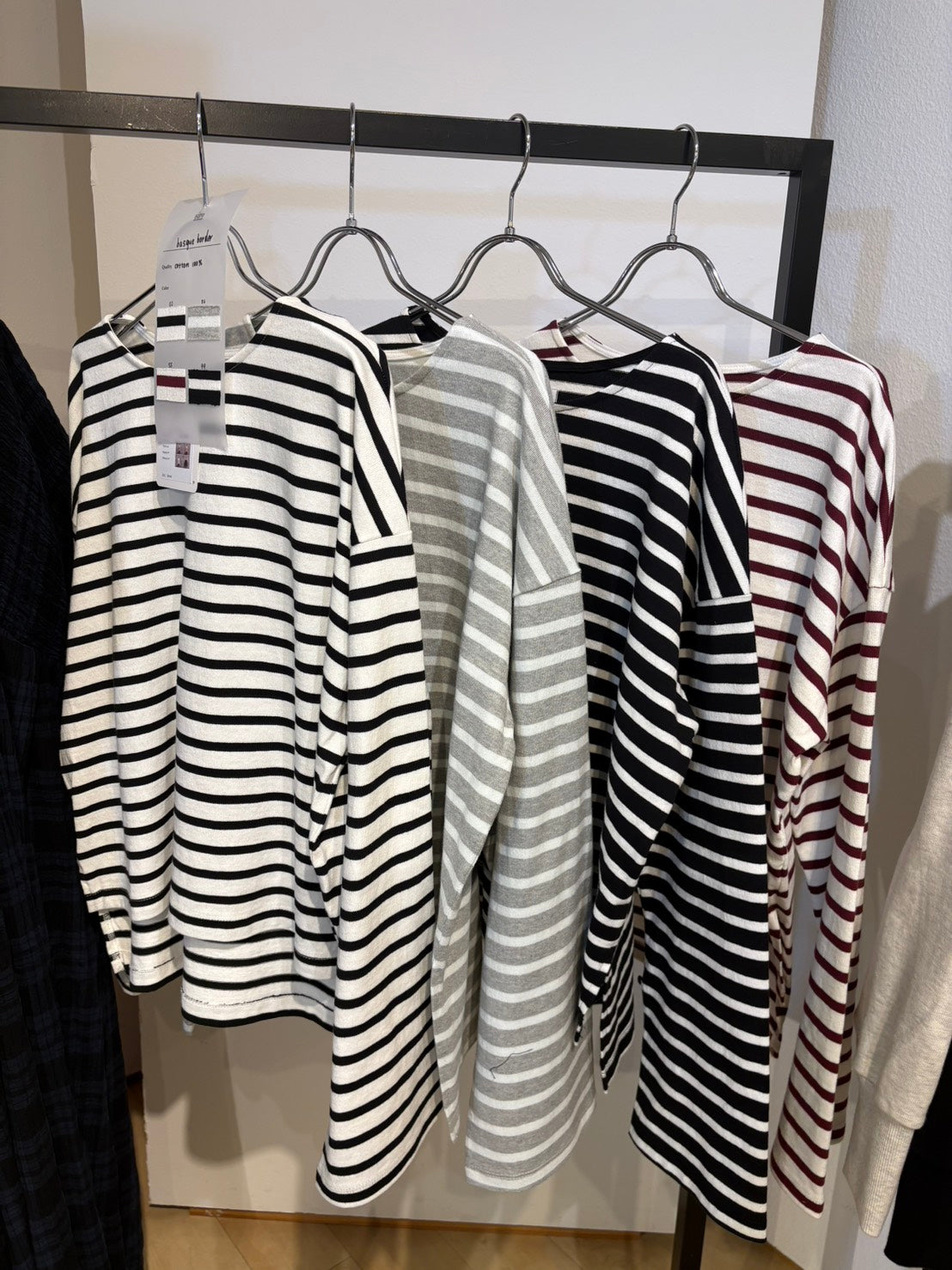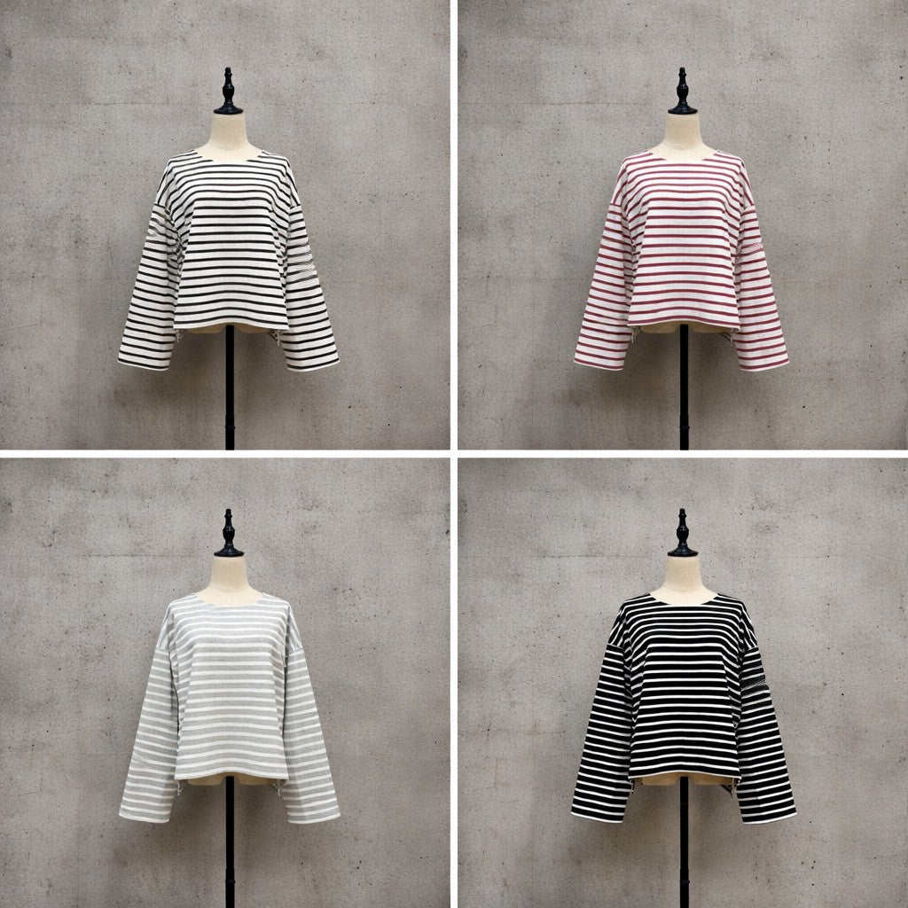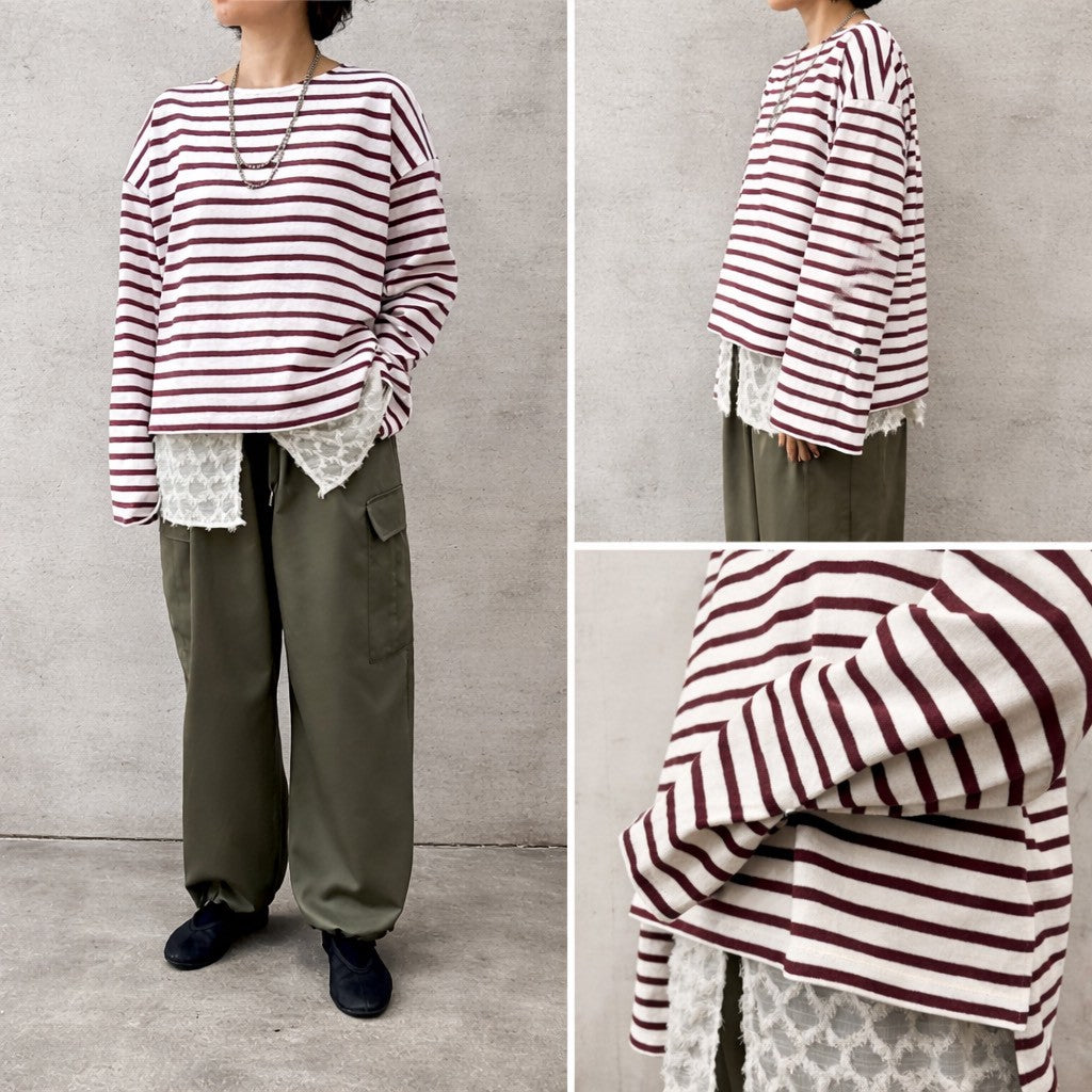 太目の袖がポイントのボーダーTです。袖口にボタンがついており袖口のシルエットを変えて着用することも可能です。
