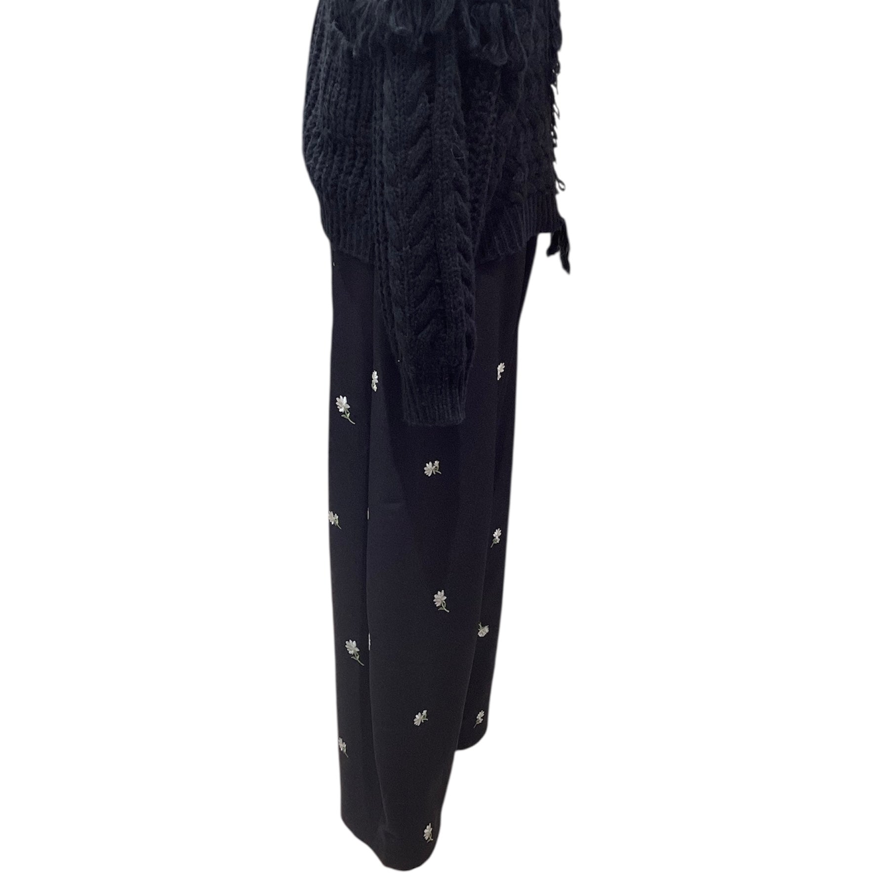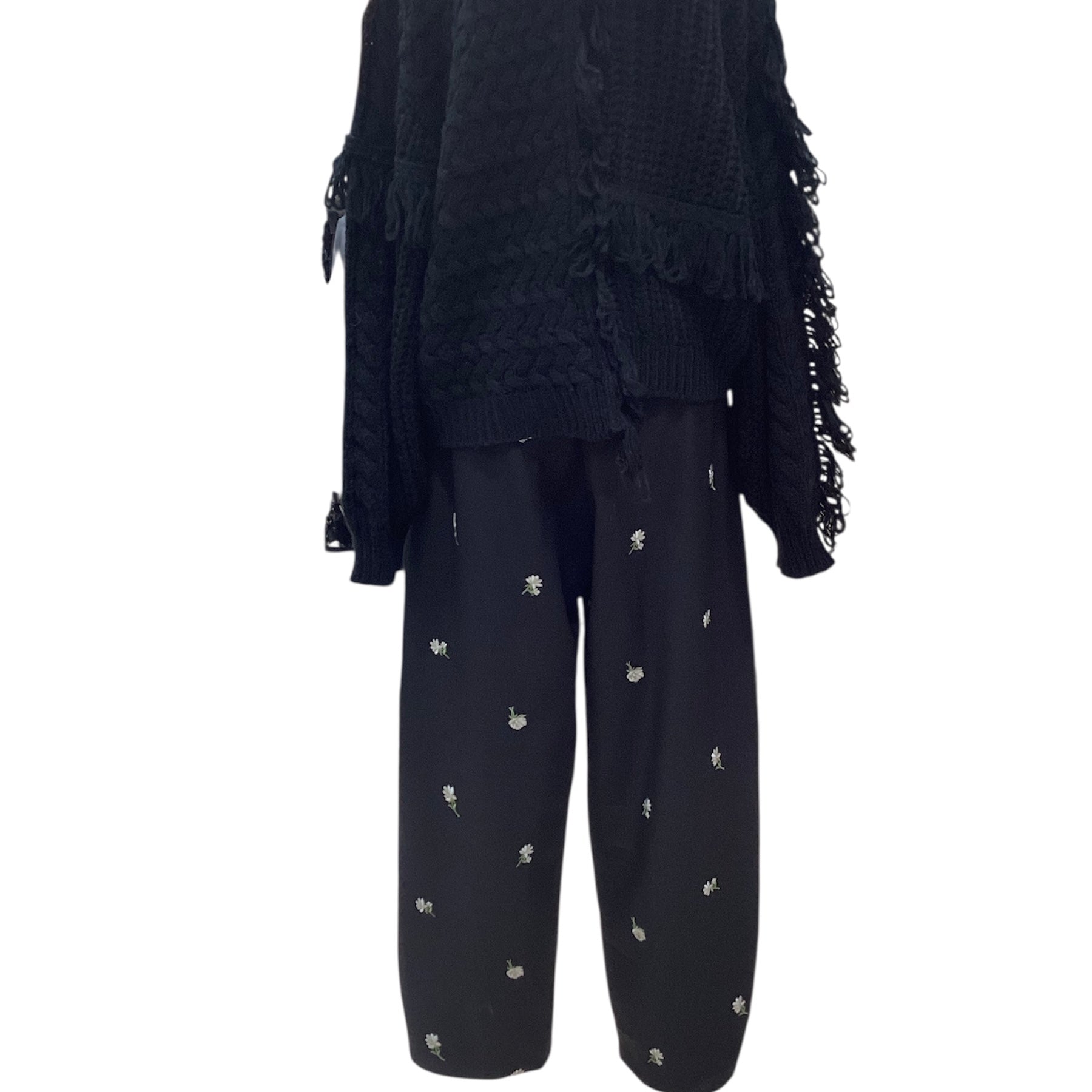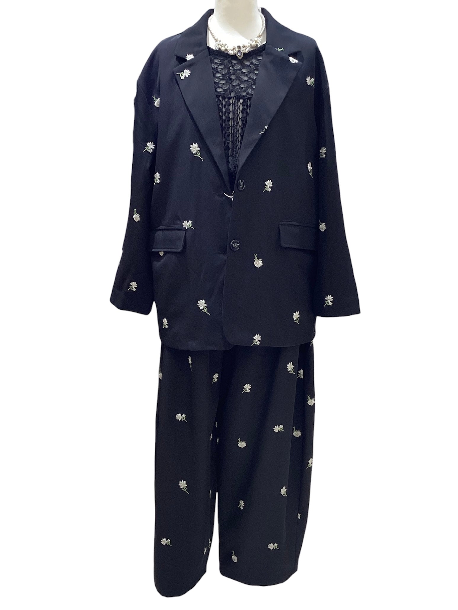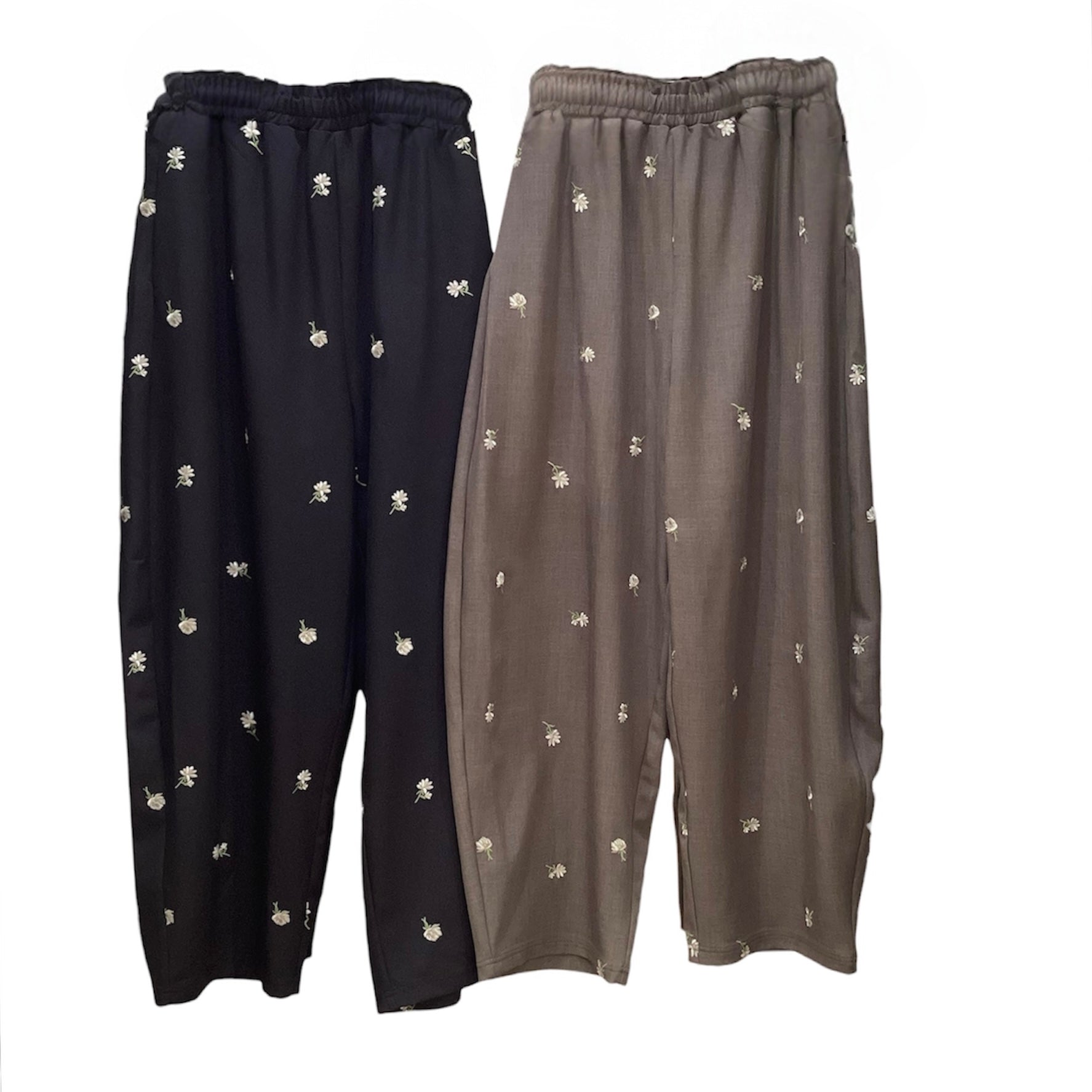 全体に施された繊細な小花柄刺繍が目を惹く、存在感抜群のイージーパンツです。裾に向かって緩やかにカーブを描くコクーンシルエットを採用し、リラックス感とモードな雰囲気を両立させています。