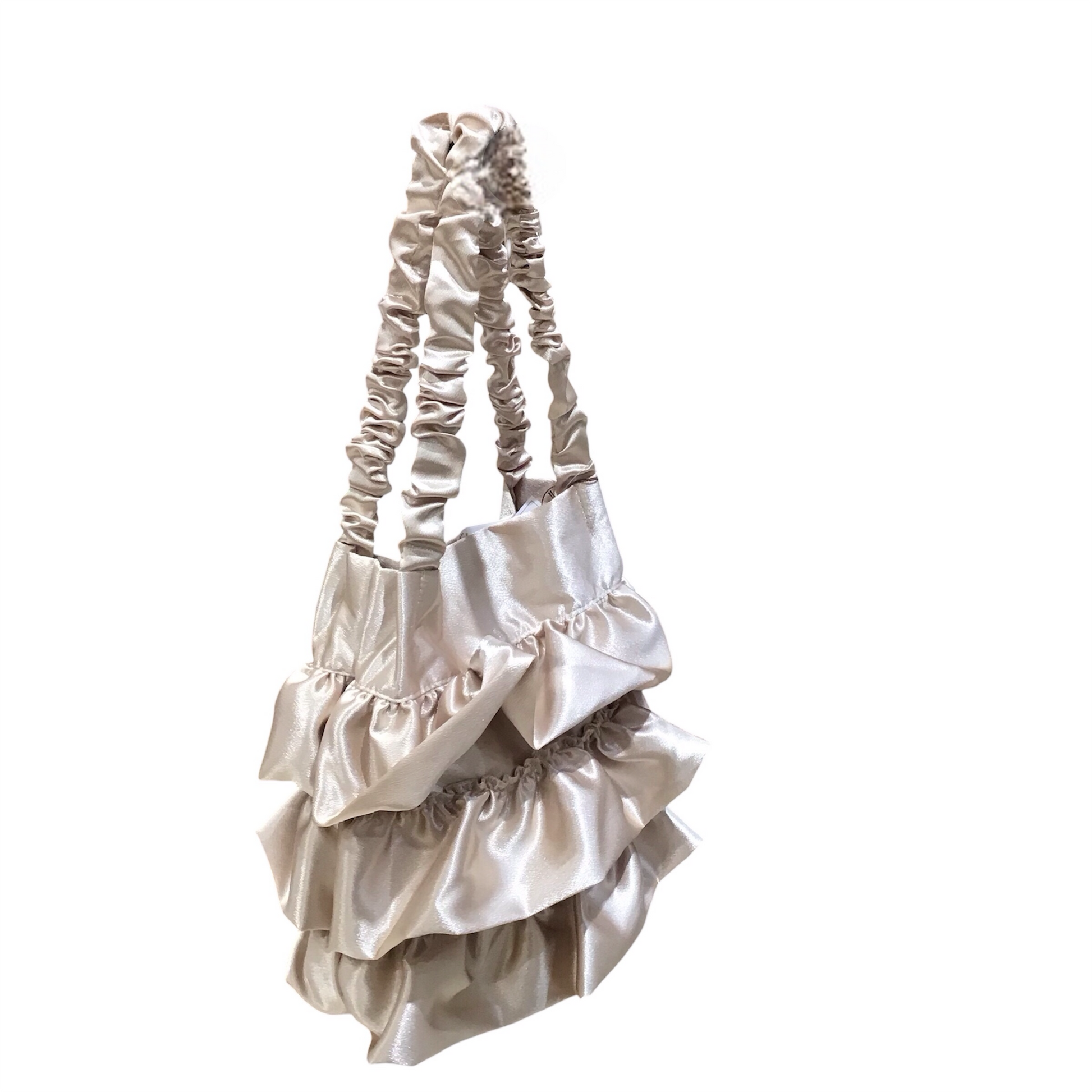 サテンの光沢感がコーデのアクセントになり、スタイリングえおより華やかにしてくれます。ギャザーハンドルも可愛いく、軽くて柔らかいのでデイリー使いもしやすいです◎マグネットボタンで開閉。内ファスナーポケット1つ、ポケット1つあり。
