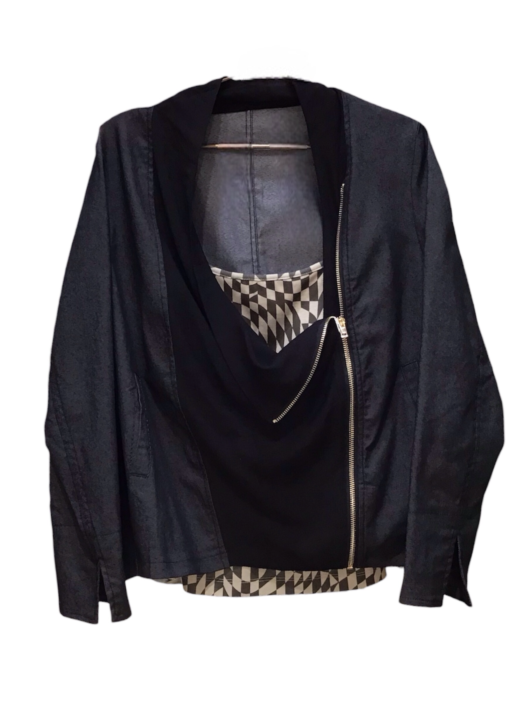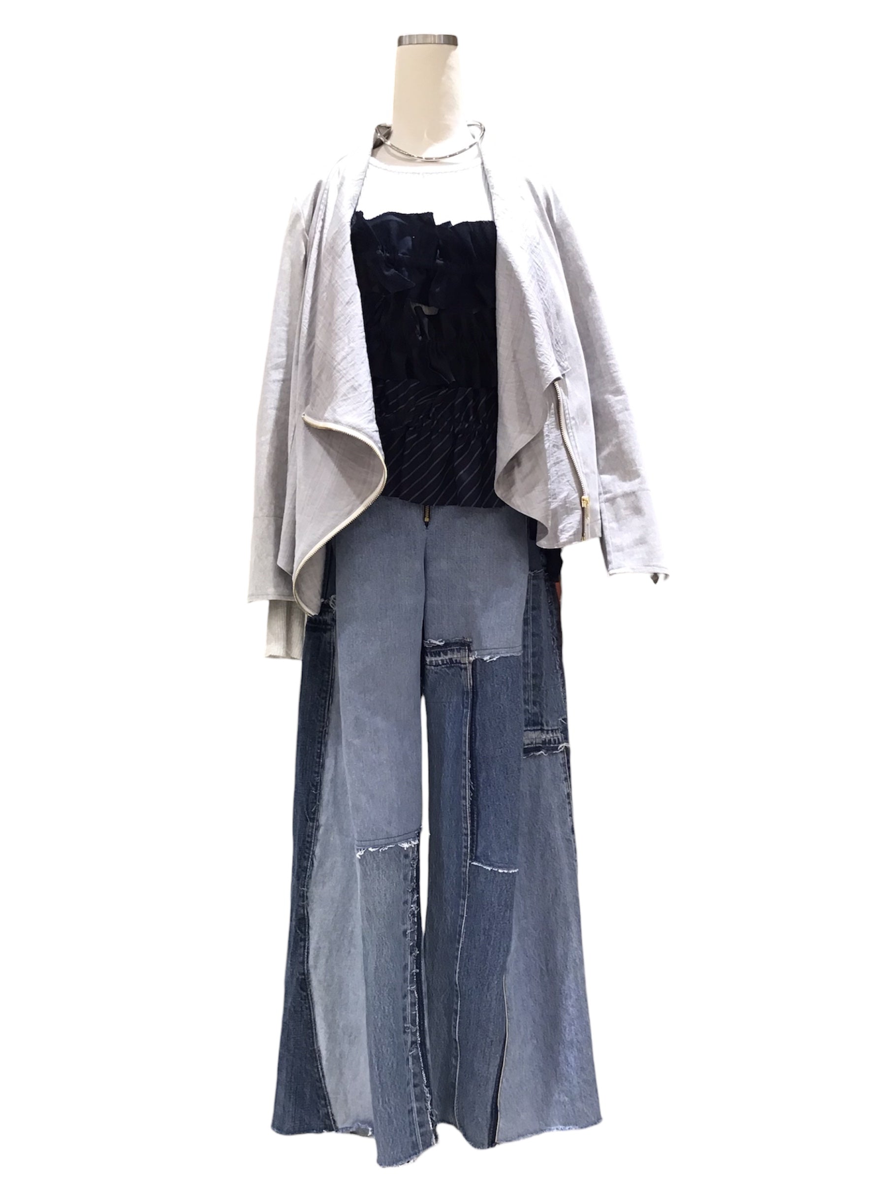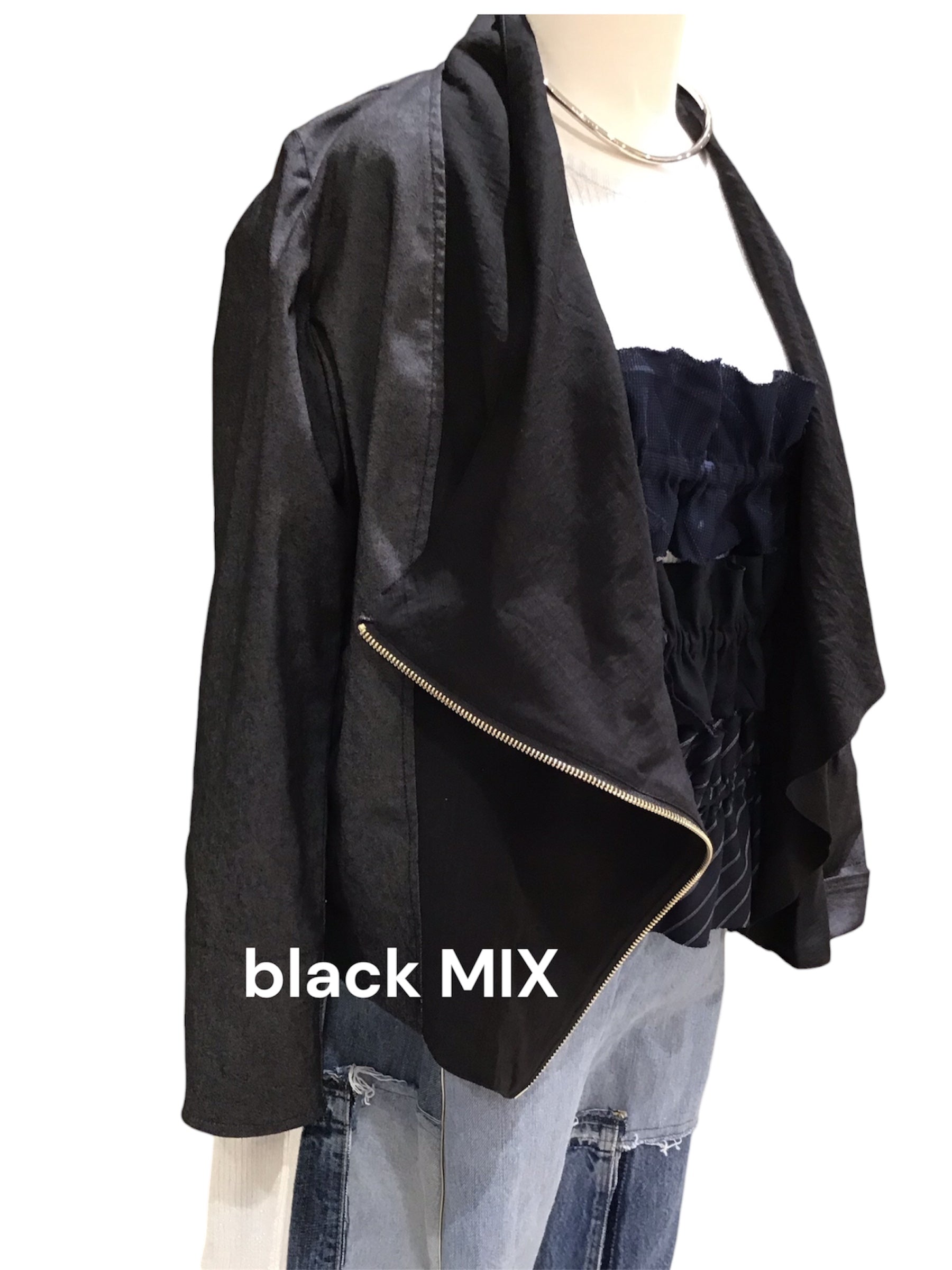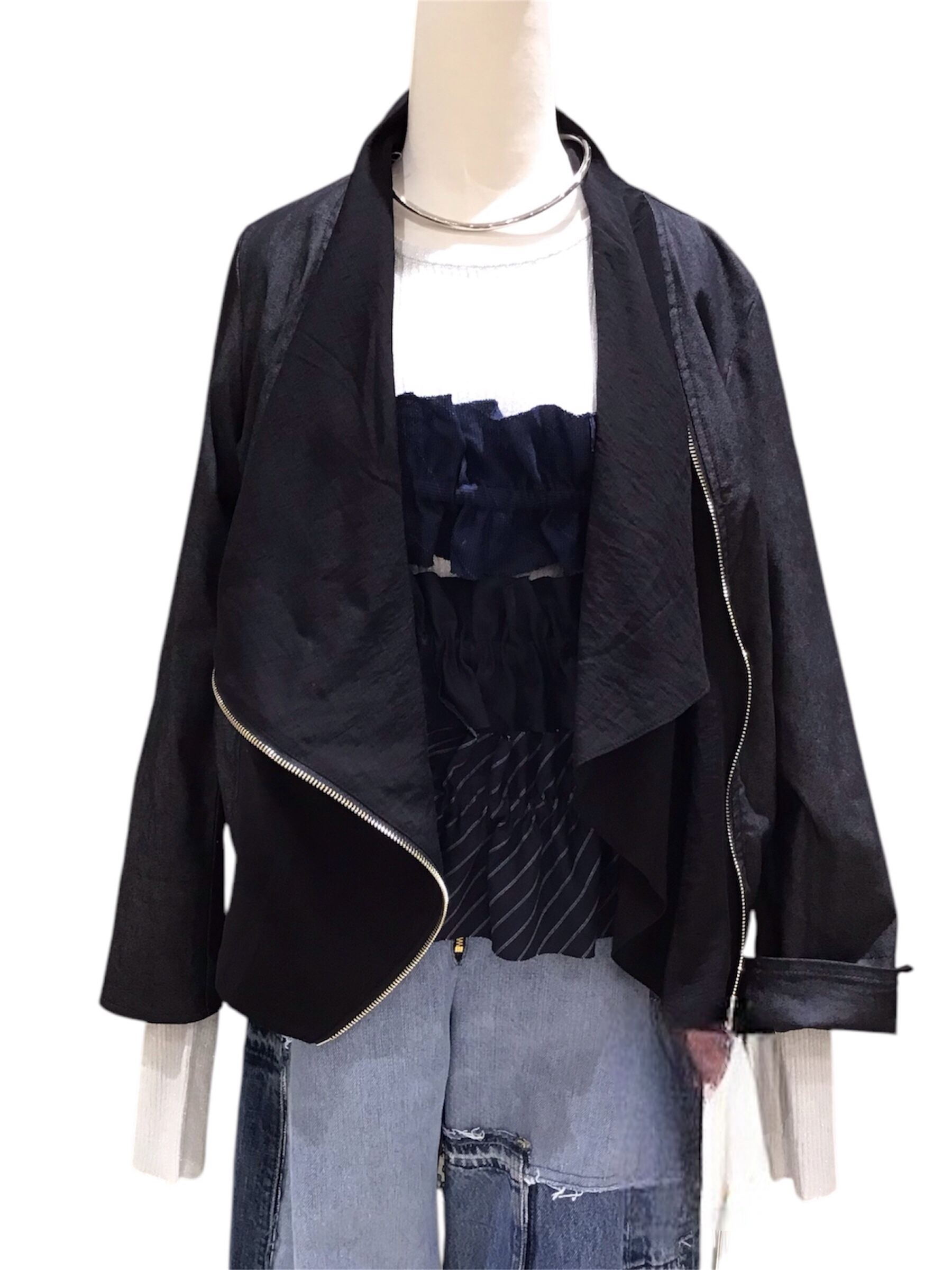 柔らかくデニムライクな伸縮性のある身頃に、襟部分にブラウス素材が使用されたライトな羽織りです。ファスナーを開けて羽織ると着流しのシルエット、閉じると襟元がクシュっとした感じになり、表情の変化も楽しんで頂けます。冷房や紫外線対策にピッタリです。/素材:綿95%、ポリウレタン5%/サイズ:フリー 身幅:約50cm、肩幅:約39cm、着丈:約60cm(平置きにて計測)