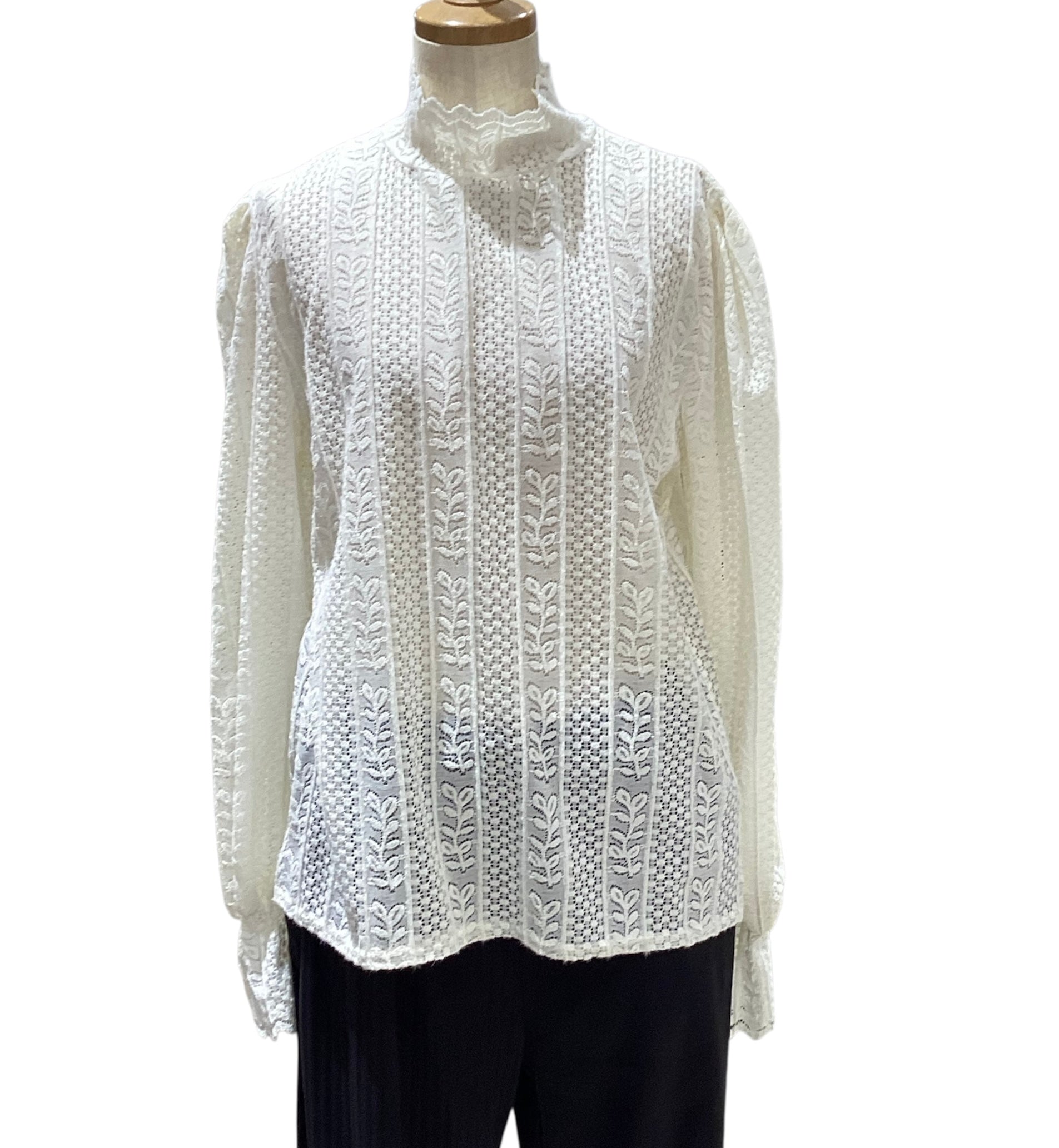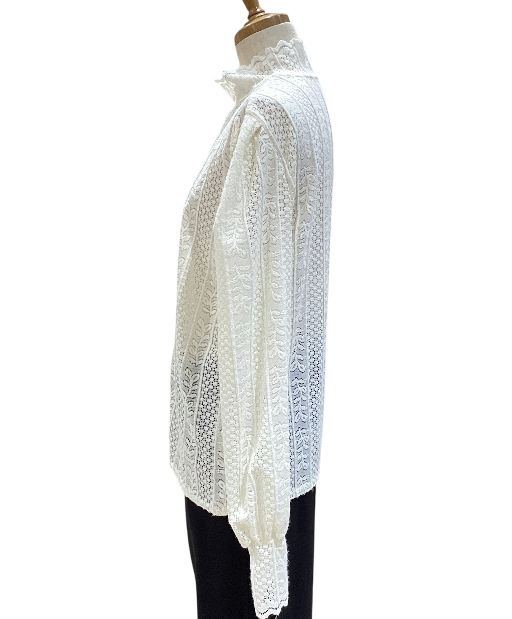 袖口フリル&ハイネックで上品な印象でインナー次第で印象も変わります。可憐な透け感で、繊細な総レースがクラシカルな一着です。肩に施したボリュームタックが、立体感と華やかさを、袖口のフリルとハイネックが、上品な甘さを添えてくれます。