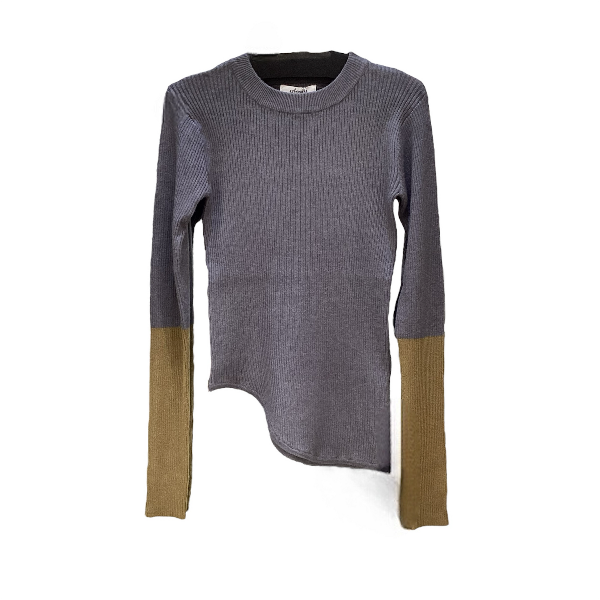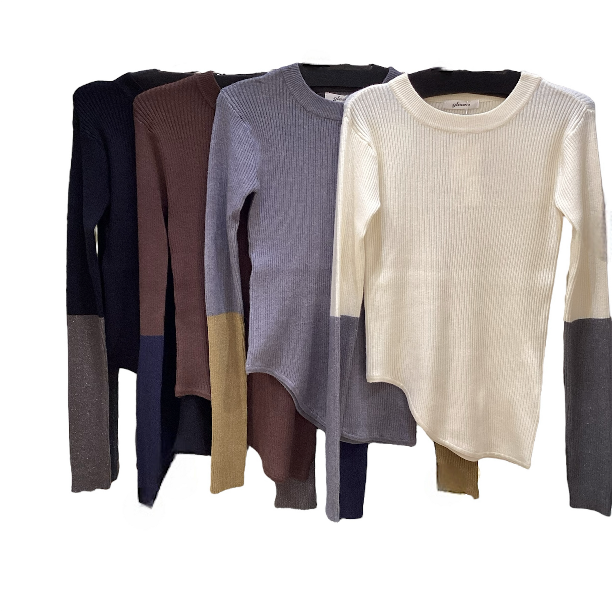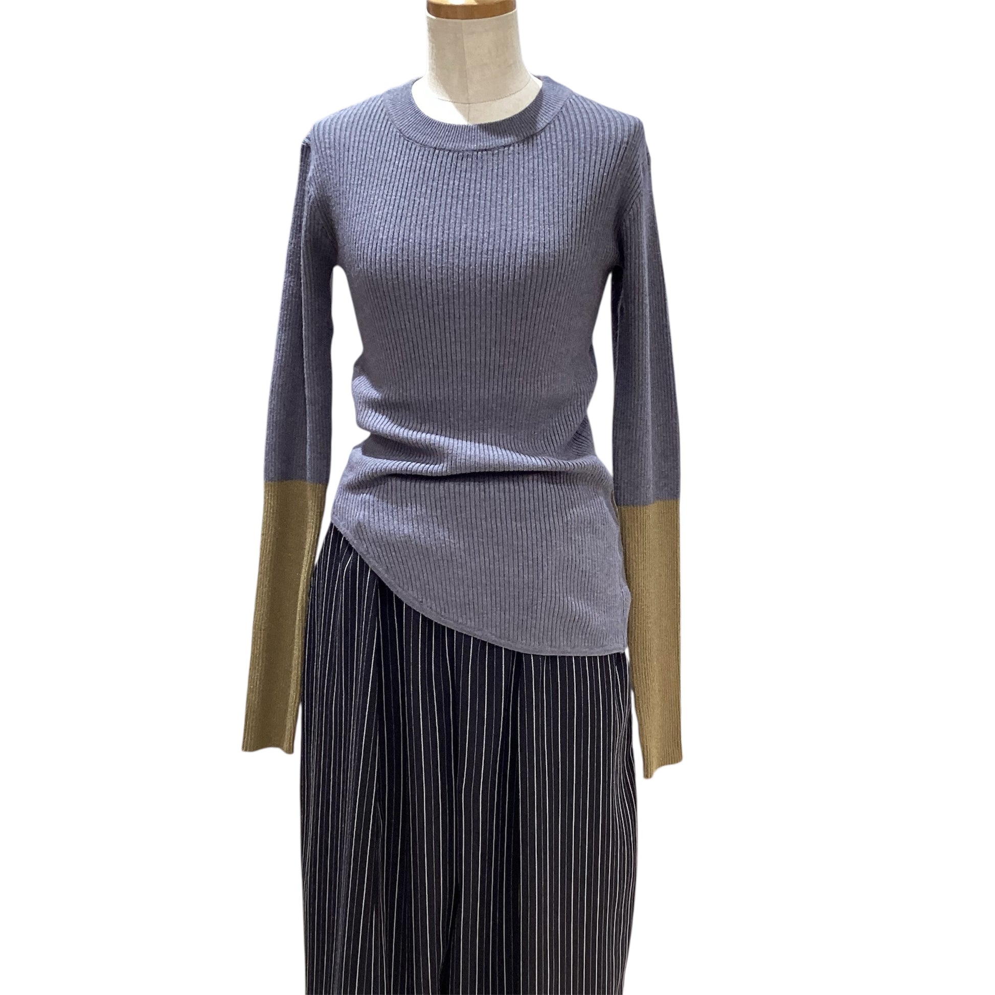 体のラインを拾い過ぎない程よいフィット感のリブデザインで、袖口に施したラメ入り配色がアクセントを効かせ洗練された印象に。トレンドの指穴をプラスしたデザインに裾のアシメラインが印象的です◎
