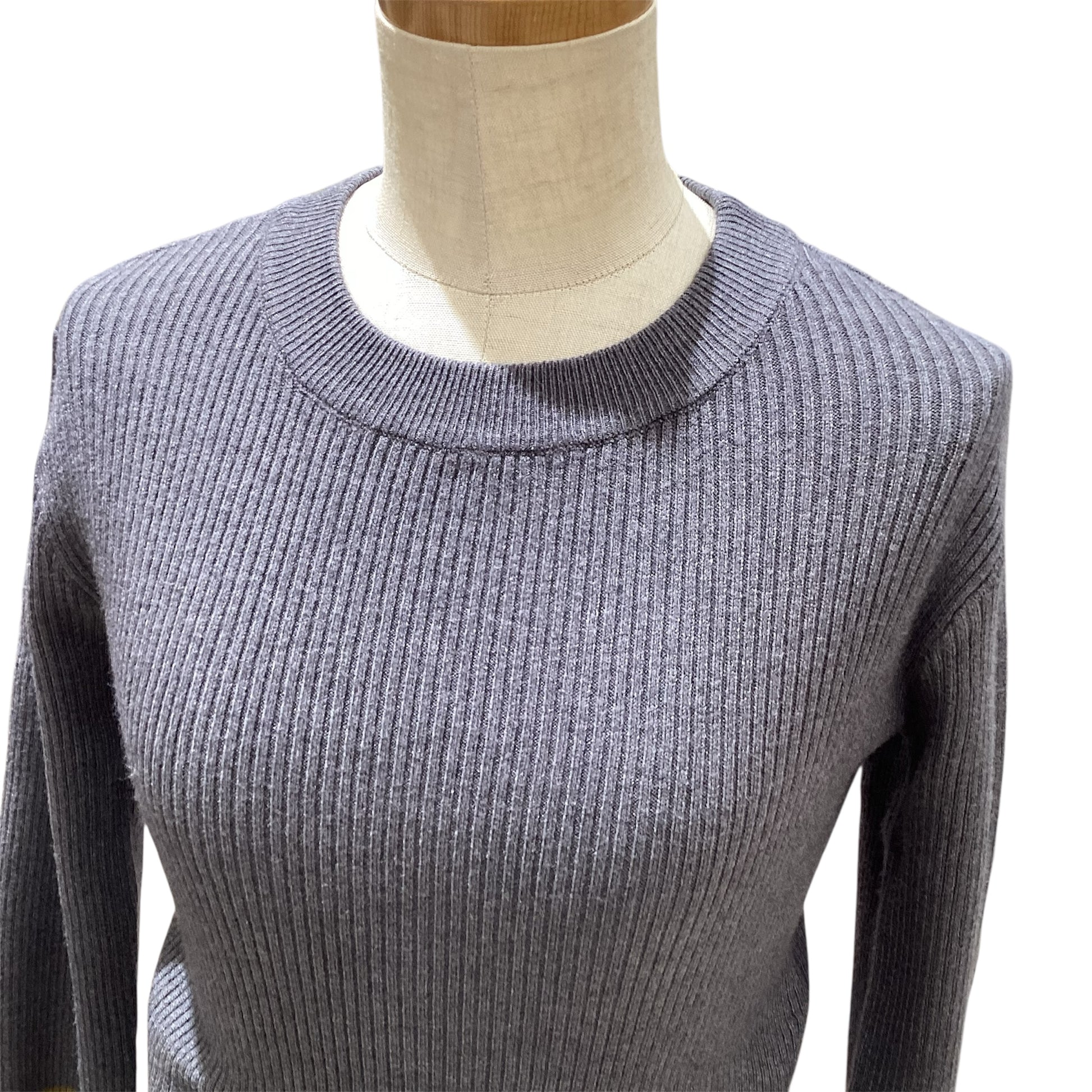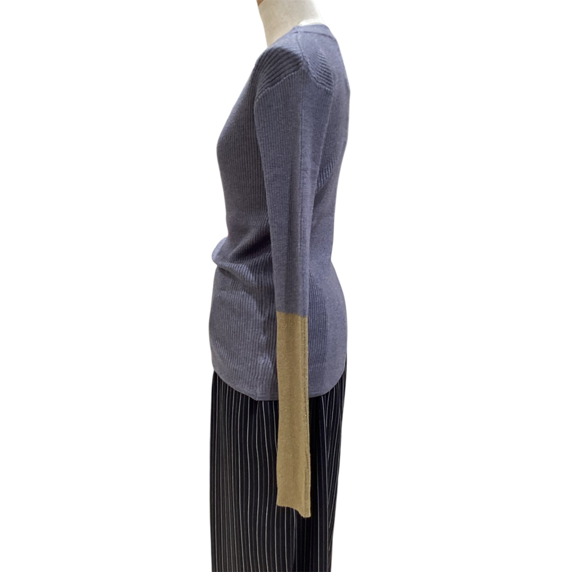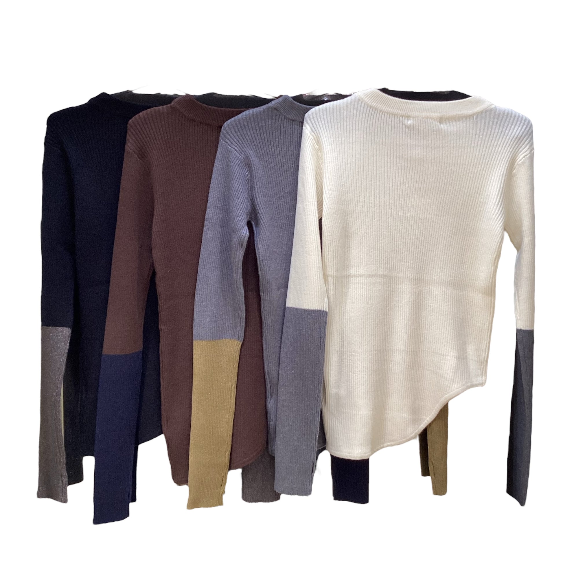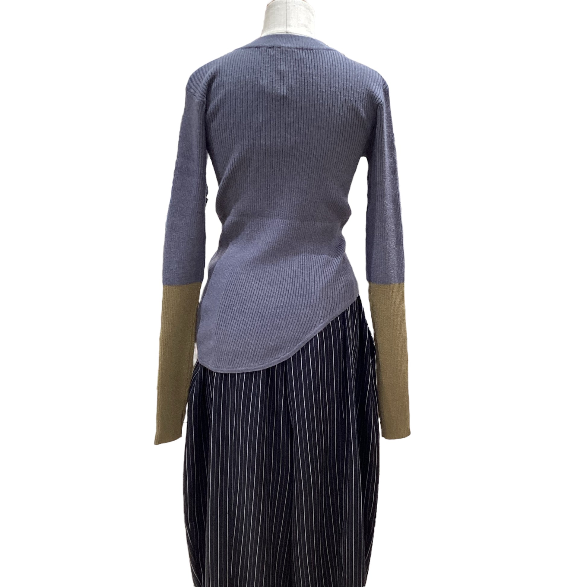 体のラインを拾い過ぎない程よいフィット感のリブデザインで、袖口に施したラメ入り配色がアクセントを効かせ洗練された印象に。トレンドの指穴をプラスしたデザインに裾のアシメラインが印象的です◎