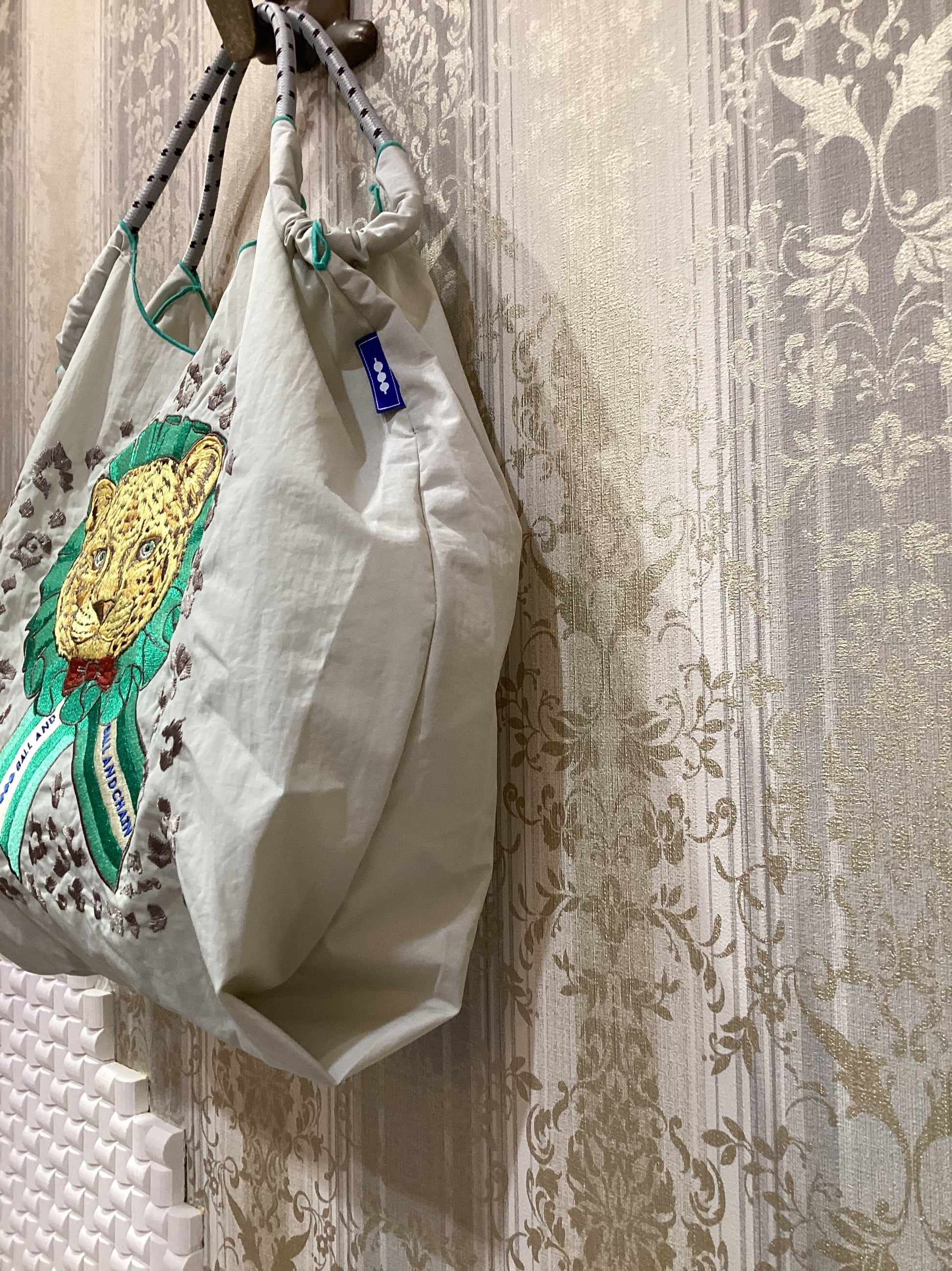 サイズ M 横幅 約40cm 高さ 約35cm素材 ポリエステル100% とっても軽くて耐久性、撥水性のある人気のエコバックです。 モチーフは全て刺繍されていて高級感があります。 持ち手を片方に引き出すとショルダーバッグにもなって便利です。 A4サイズのファイルも収納できる大容量で通学や通勤にも重宝します。 プレゼントにも喜ばれます。