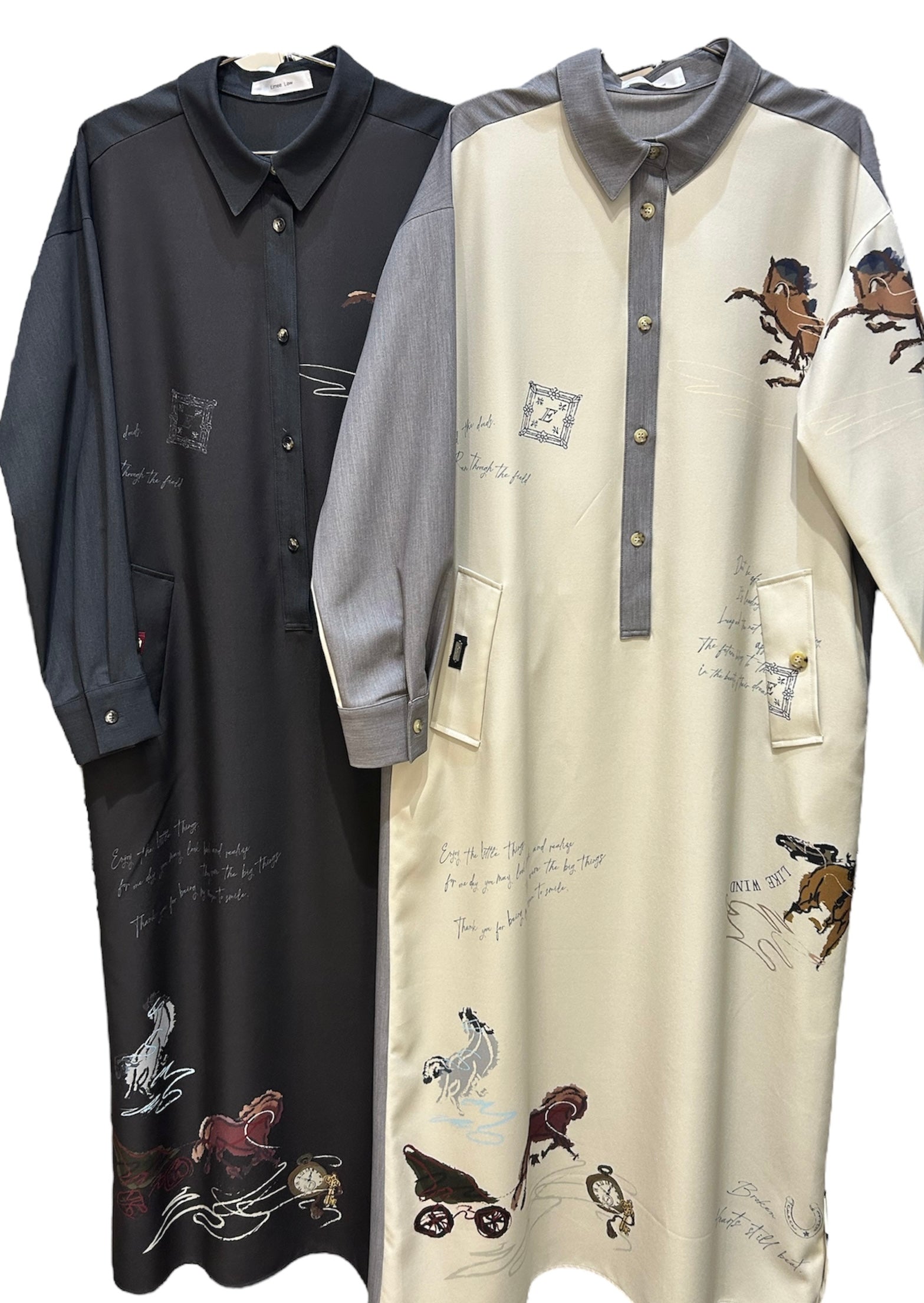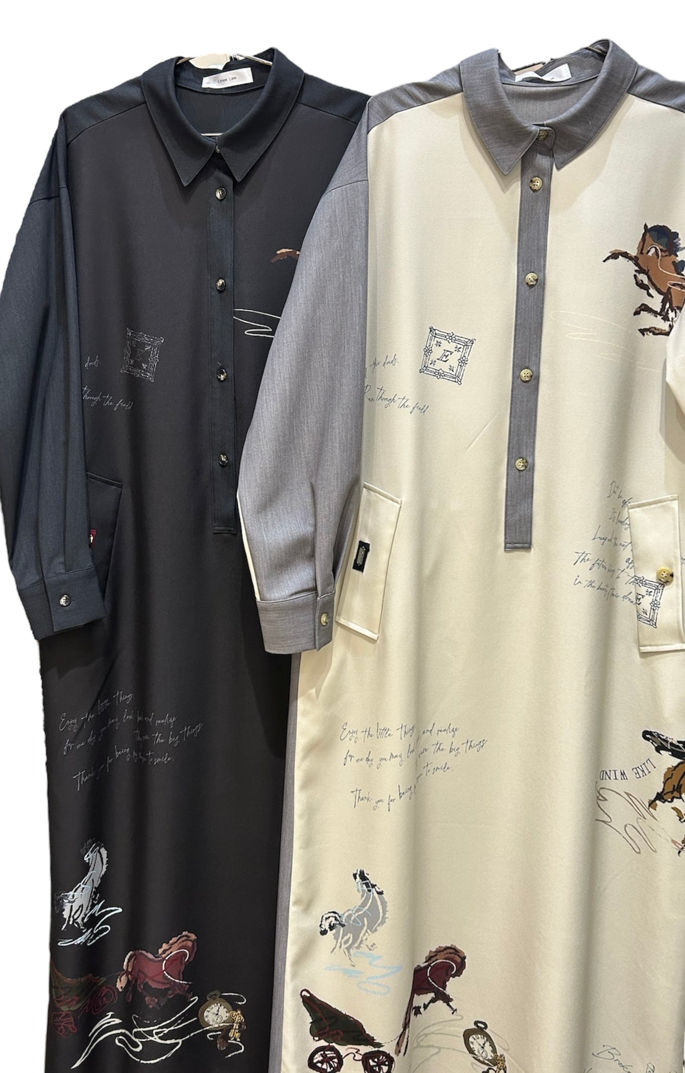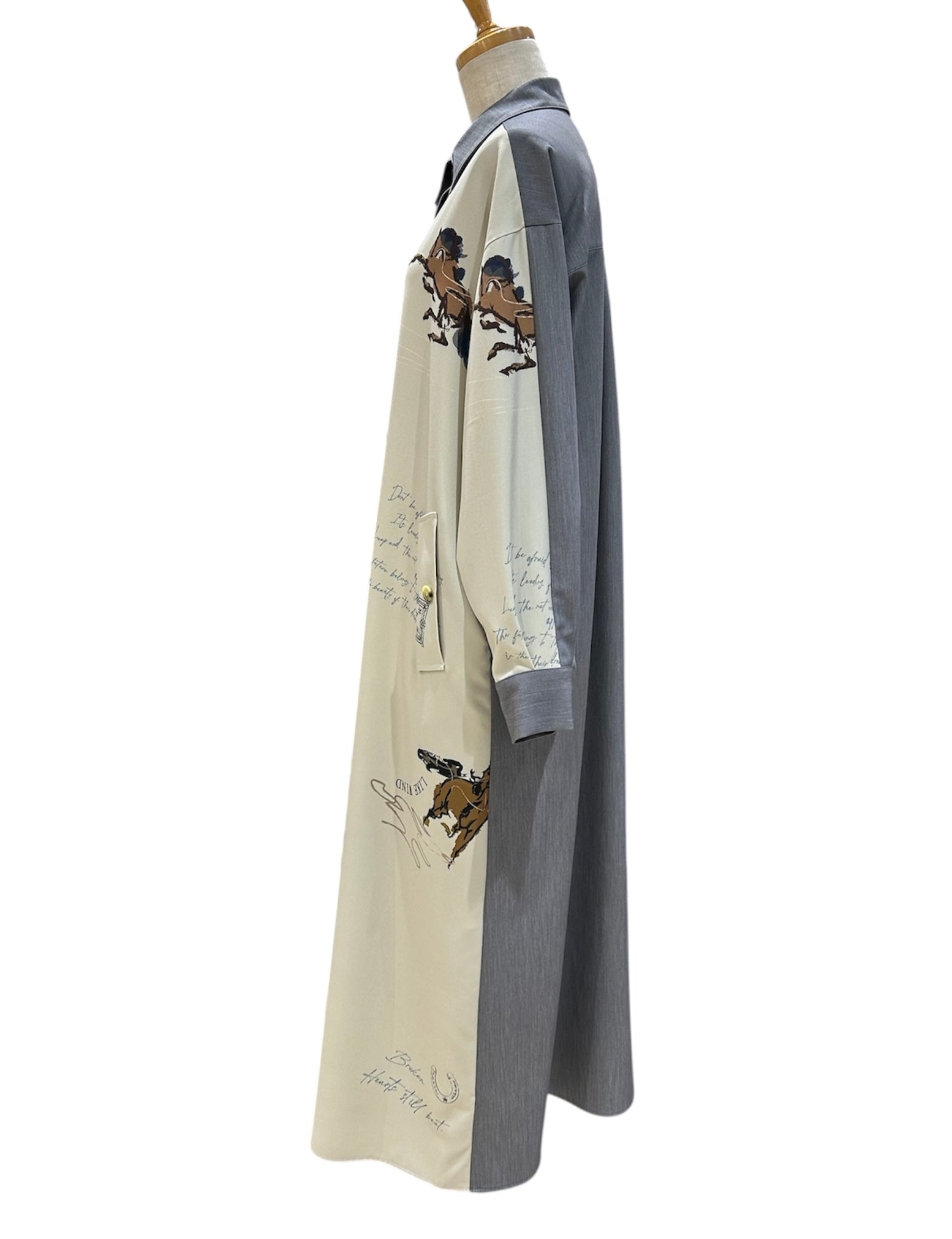 ポリエステル素材をレーヨン混の上品な素材で切り替えた馬柄プリントシャツワンピースです!
