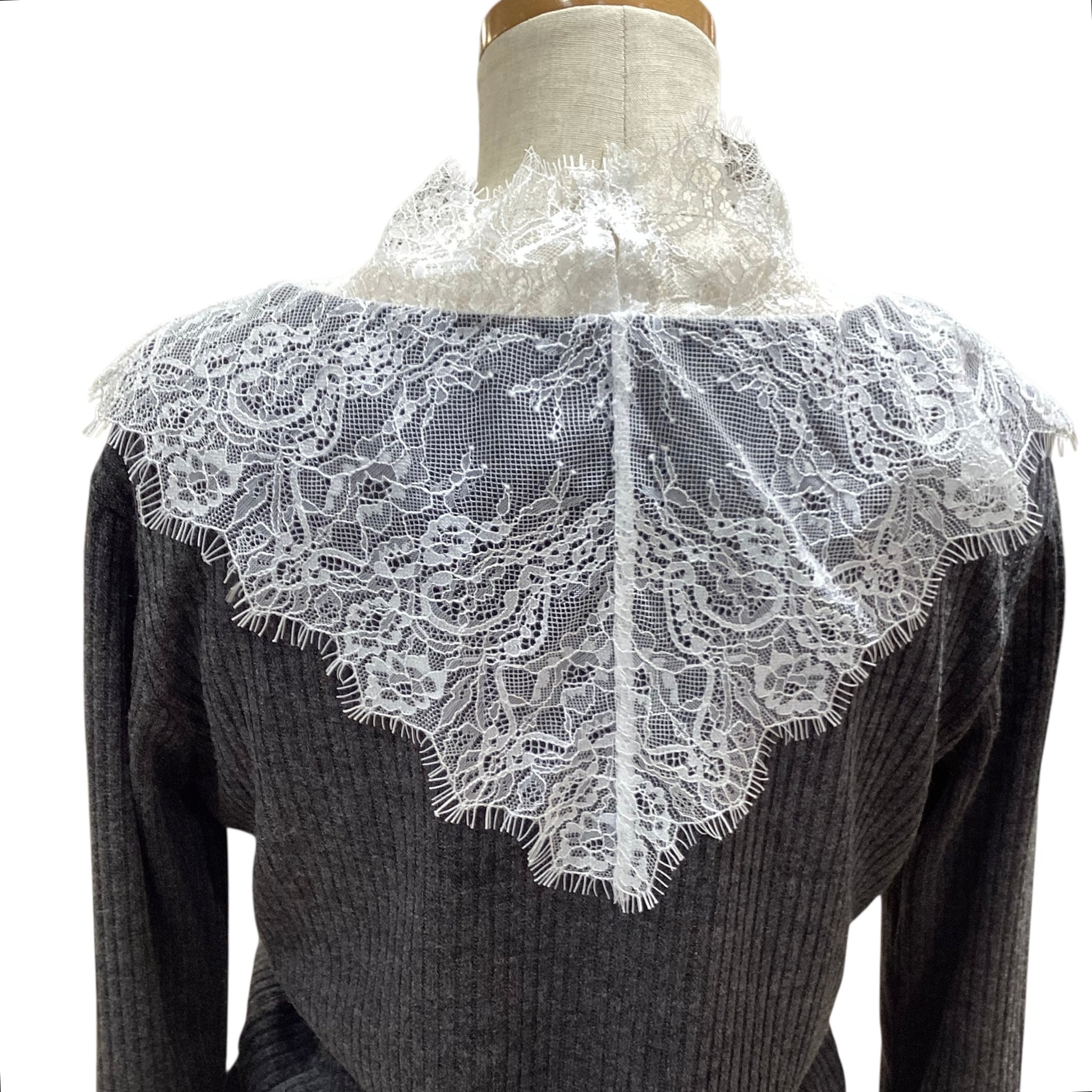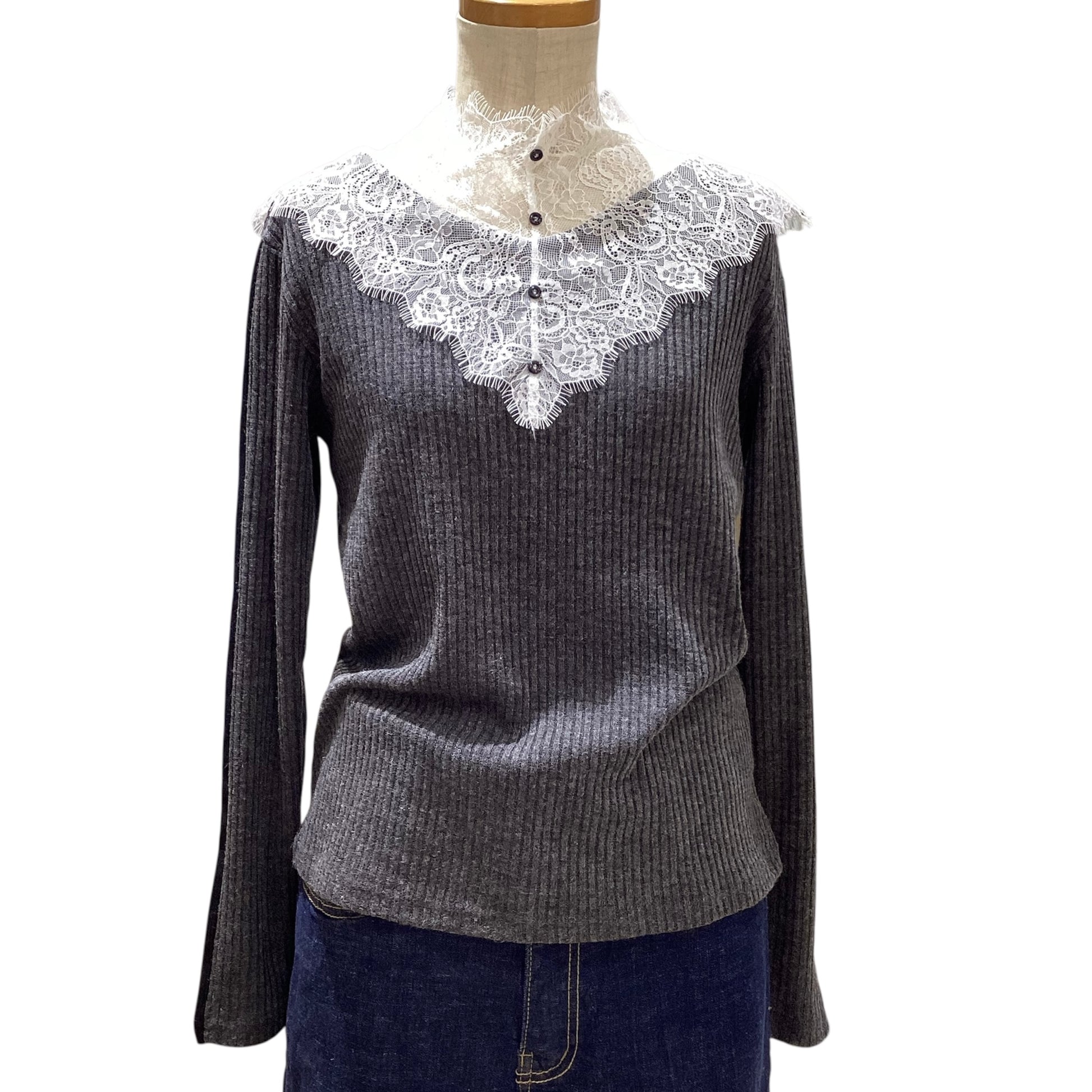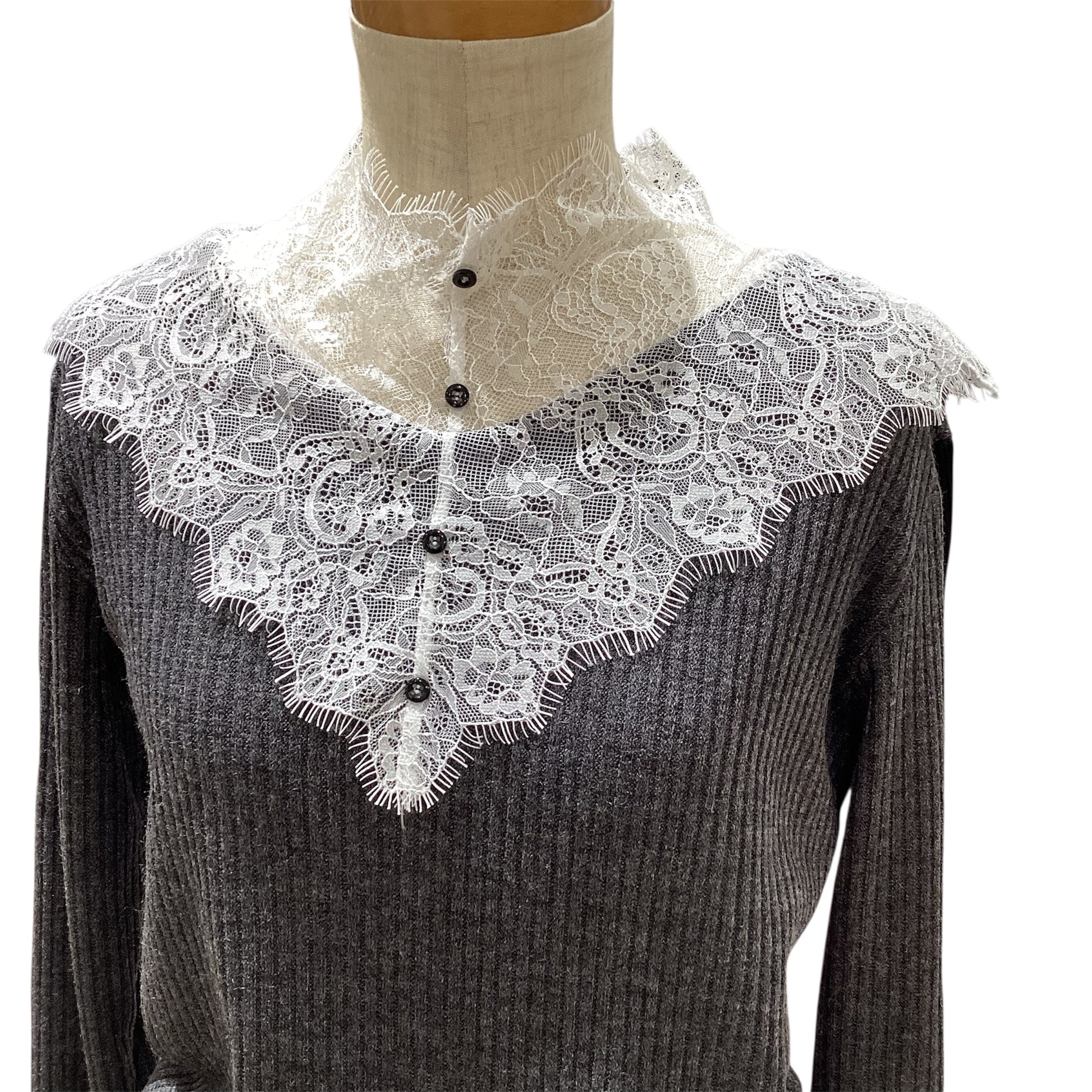 繊細なスカラップレースをあしらった衿が顔まわりを華やかな印象に◎ほどよくゆとりのあるサイズ感で身体のラインを拾いすぎず、ウエストインもしやすい丈感です。袖のラインが全体を引き締め、ジャケットやベストのインナーとしても存在感を発揮してくれます。