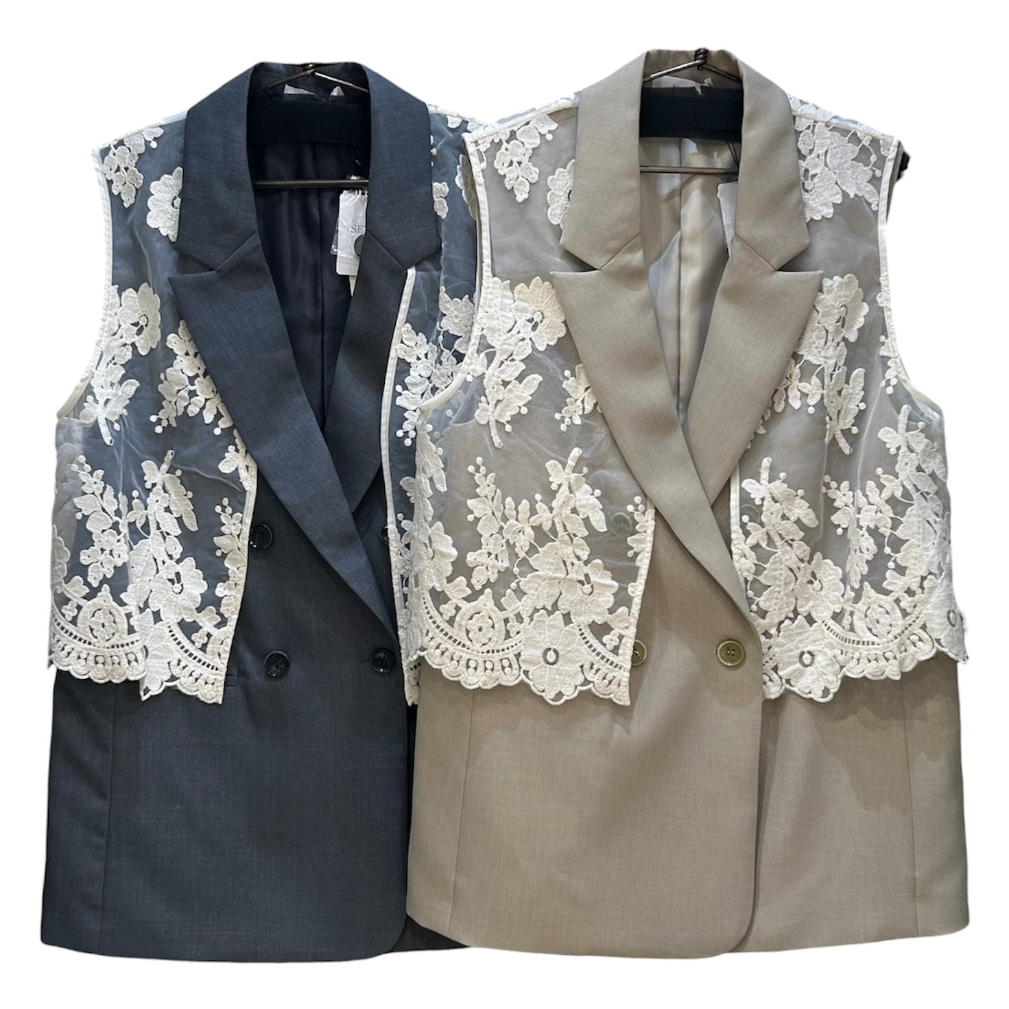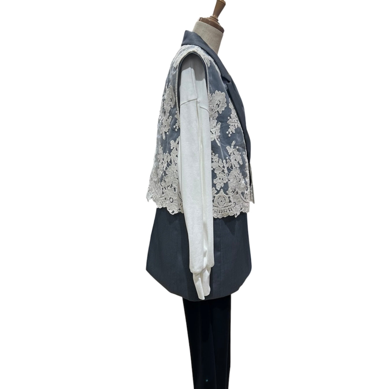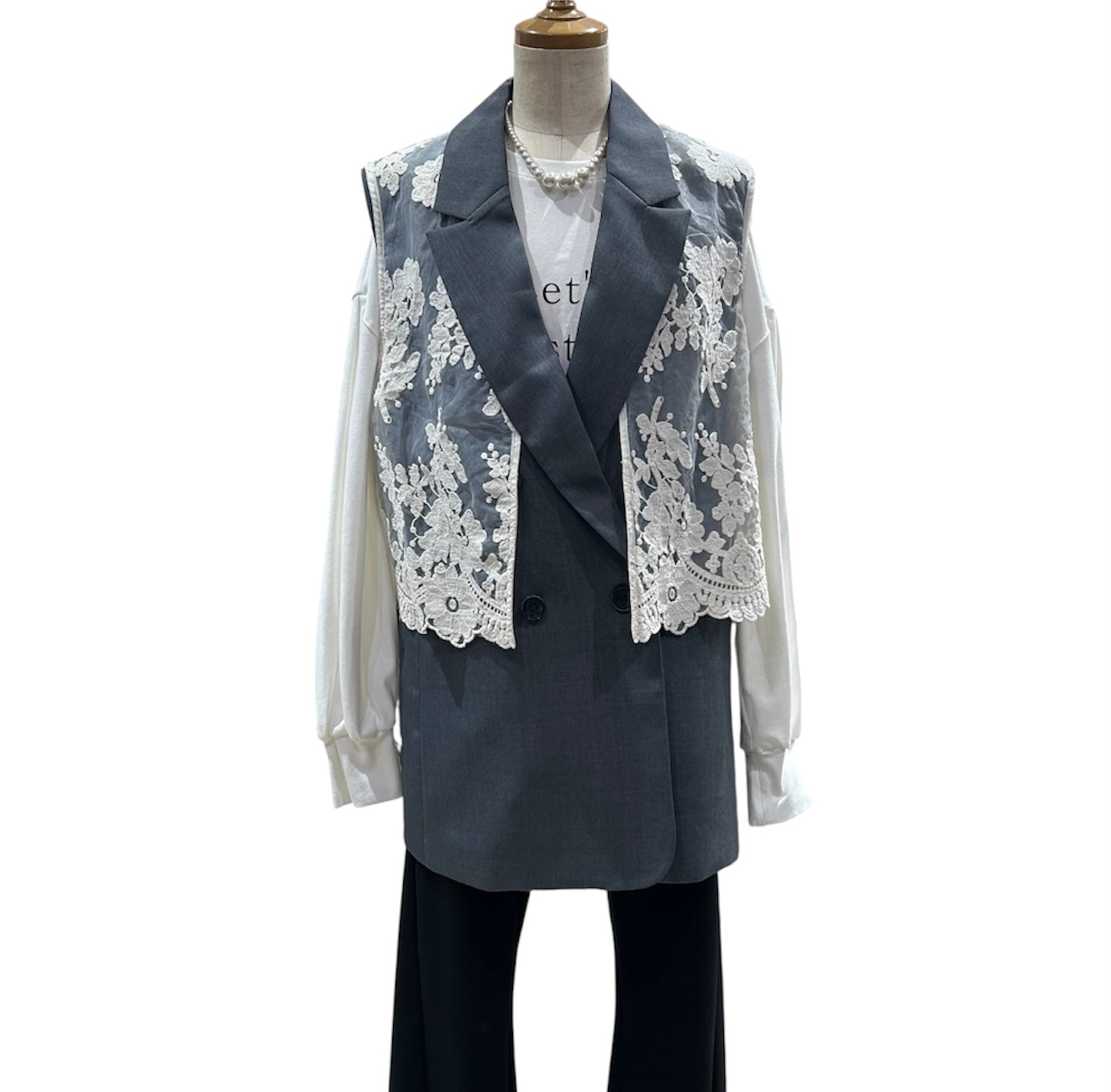 ハンサム仕上げのジレにオーガンジー刺繍ベストを合わせた存在感ある、Wボタンジレです!