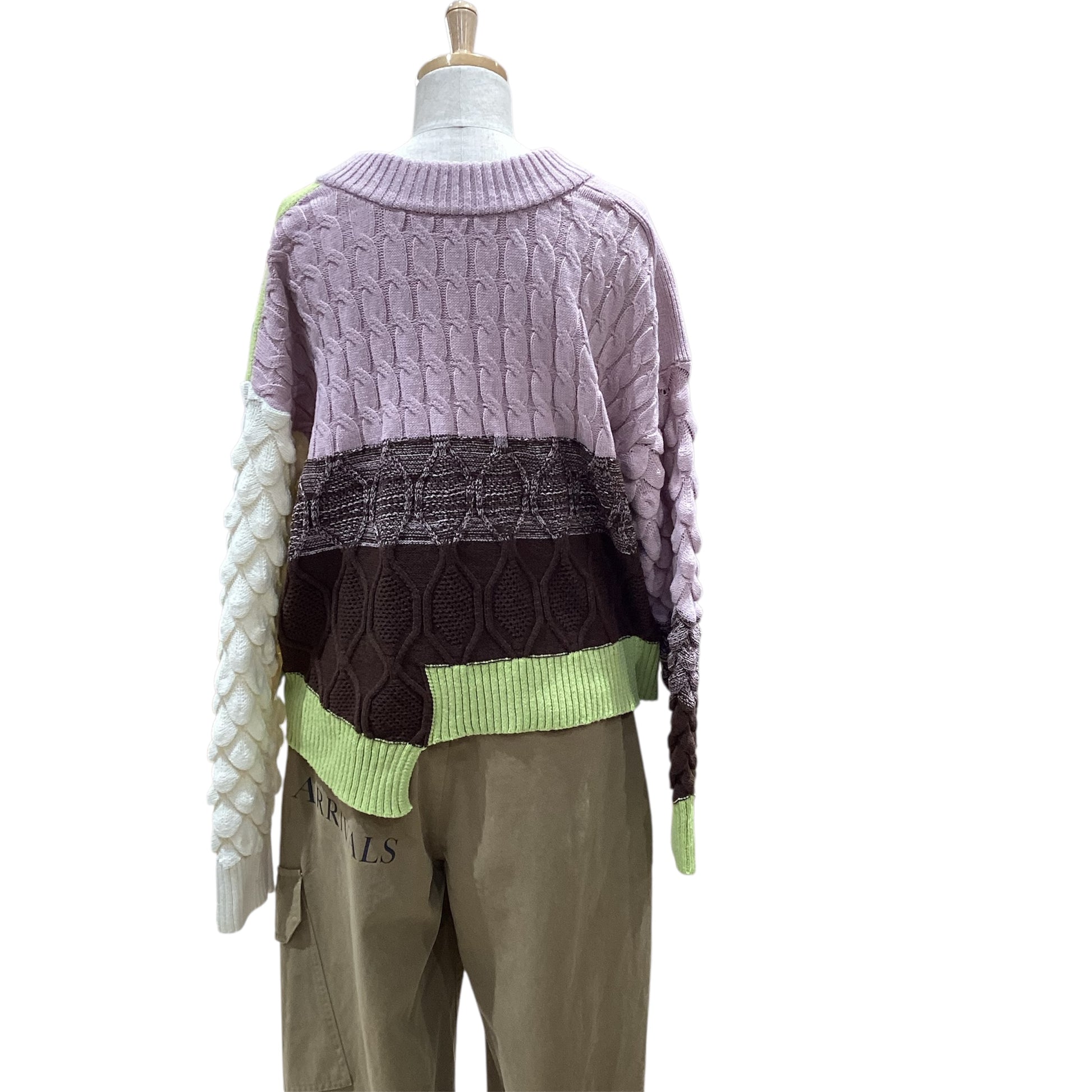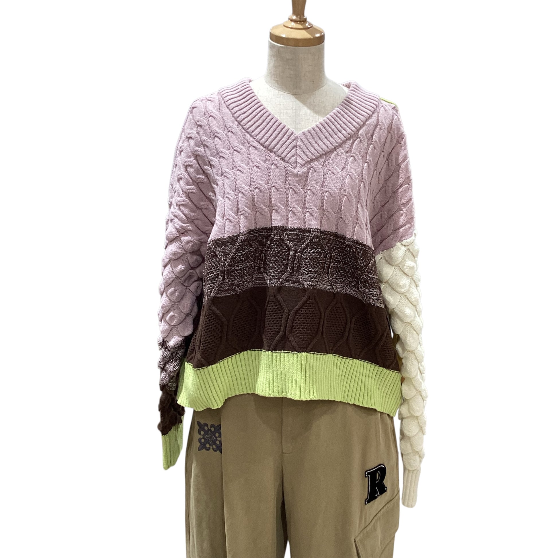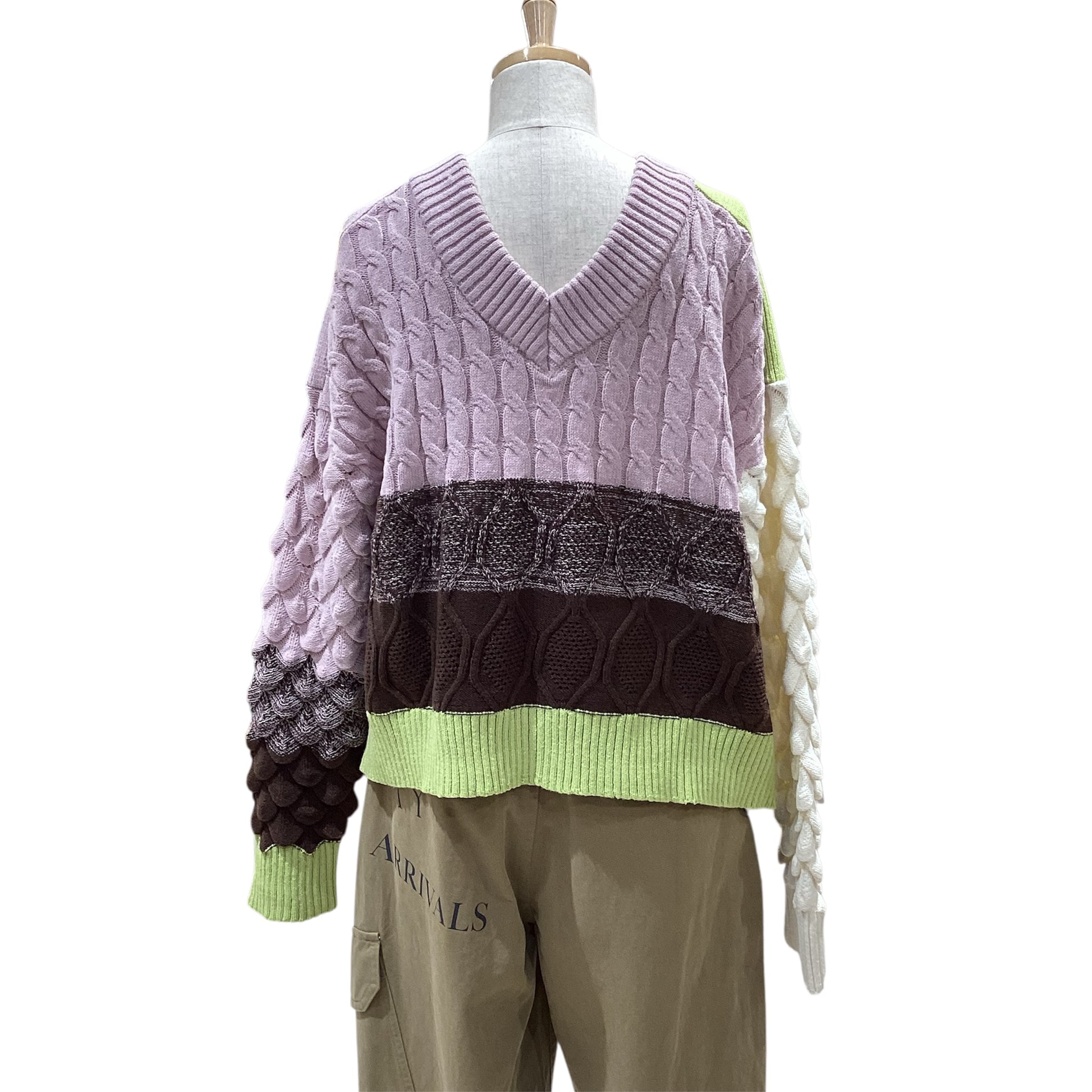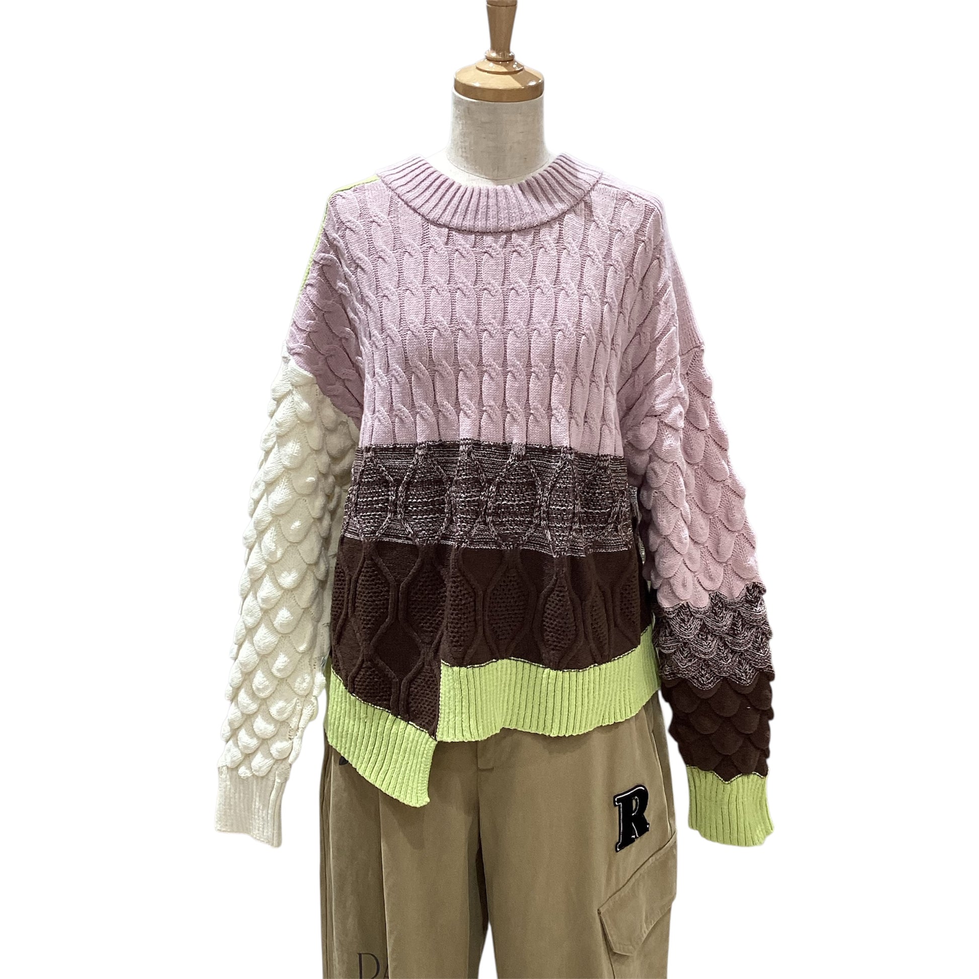 様々な編み地と配色を組み合わせたキャッチーなケーブルニットです!