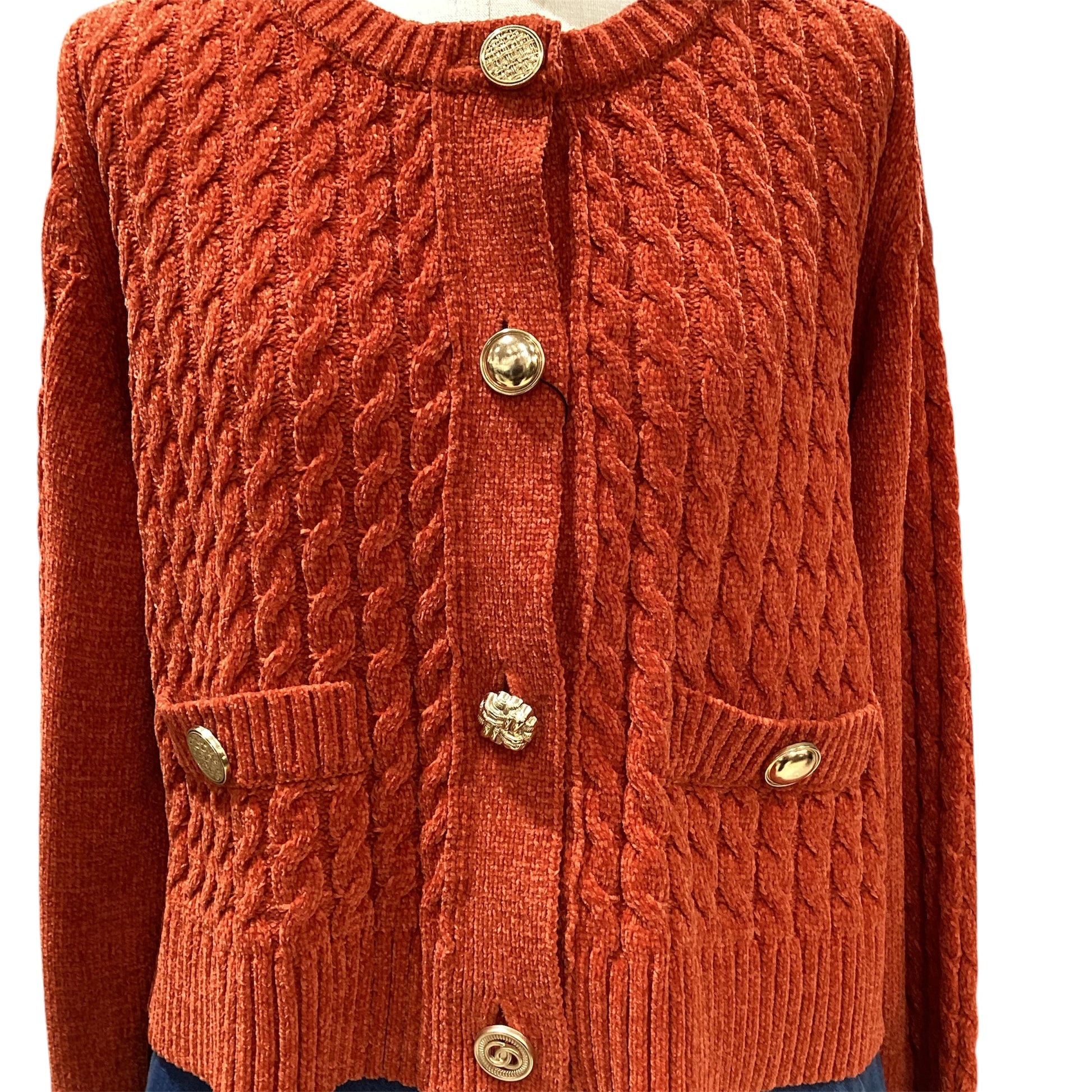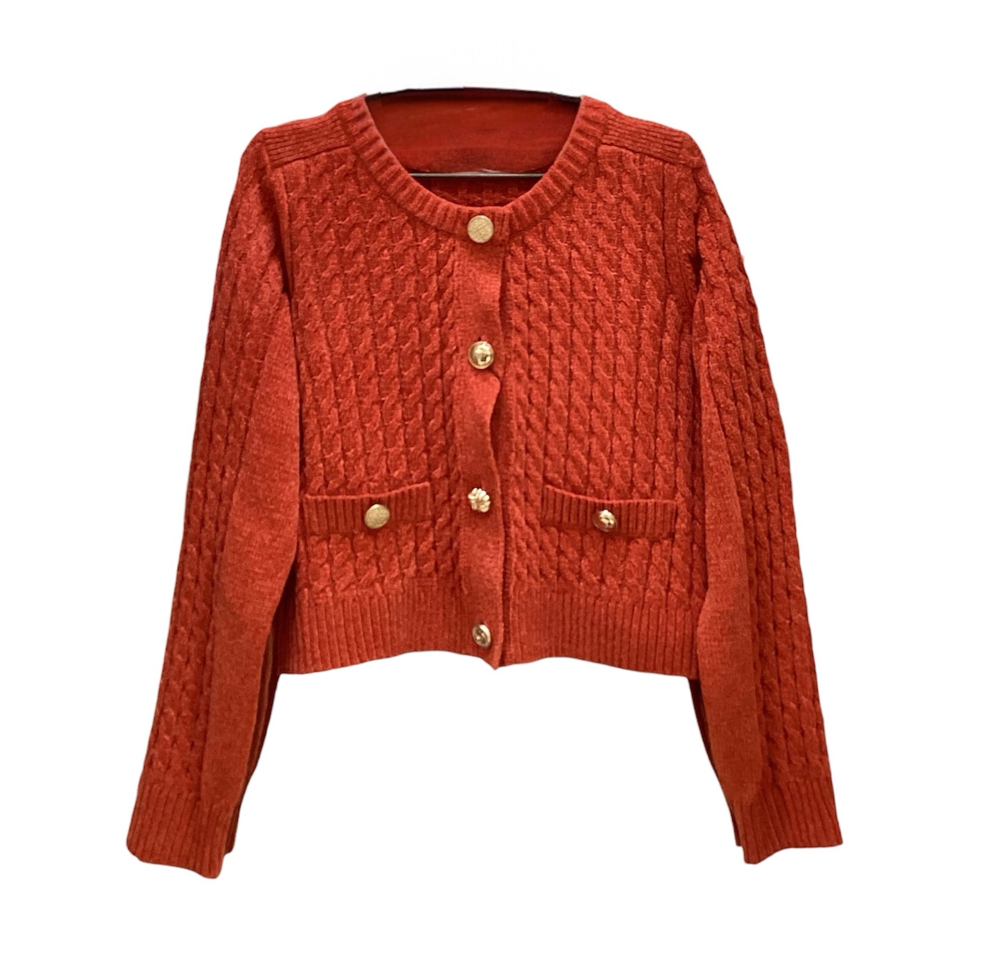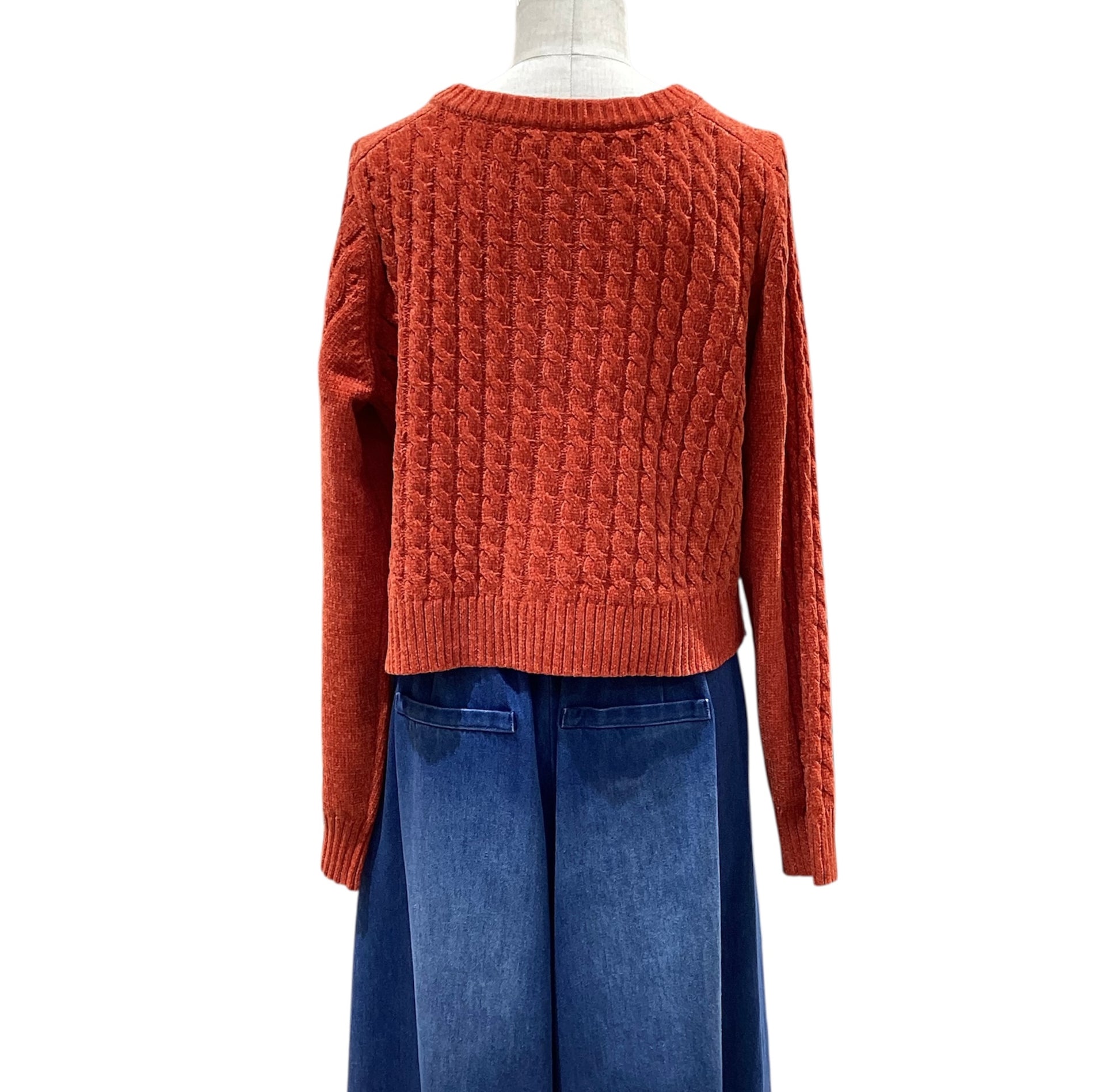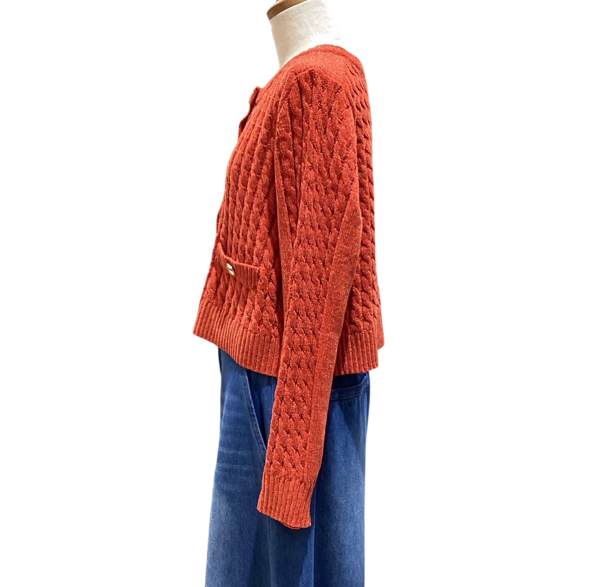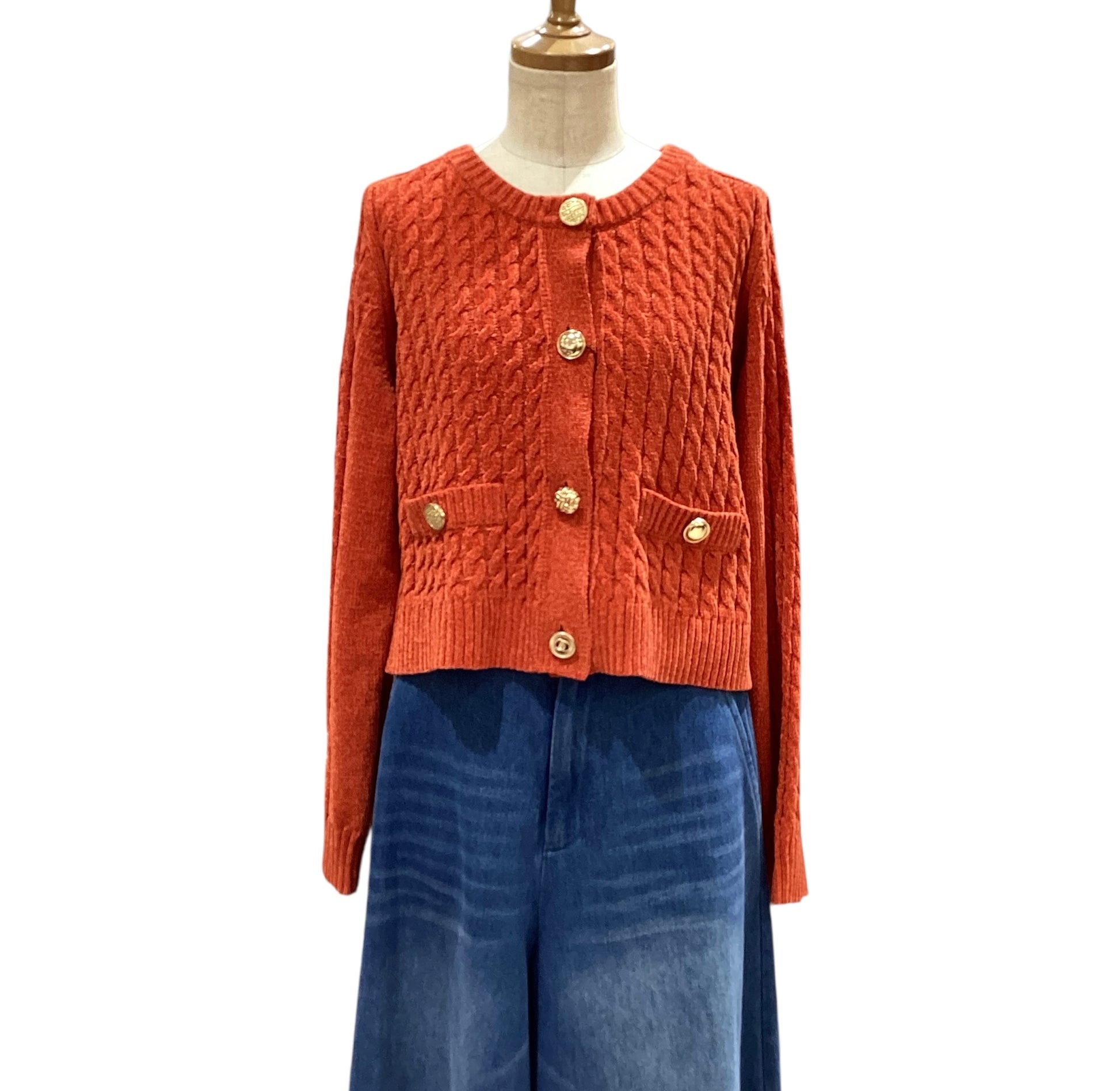 ツヤ感が上品なモール糸で仕上げたケーブルカーデ。詰まった編み地が可愛く、ポリエステルなので軽やかな仕上がりに◎ゴールドボタンは何種類か使用しキャッチーな印象です。今年らしいコンパクトなサイズ感でボリュームのあるボトムにも合わせやすくトレント感を演出できます。